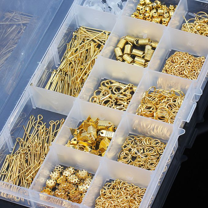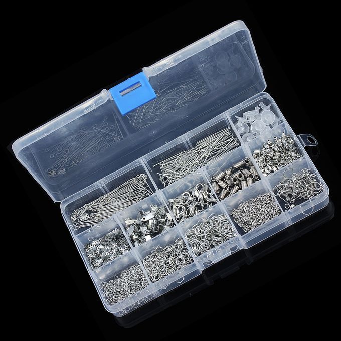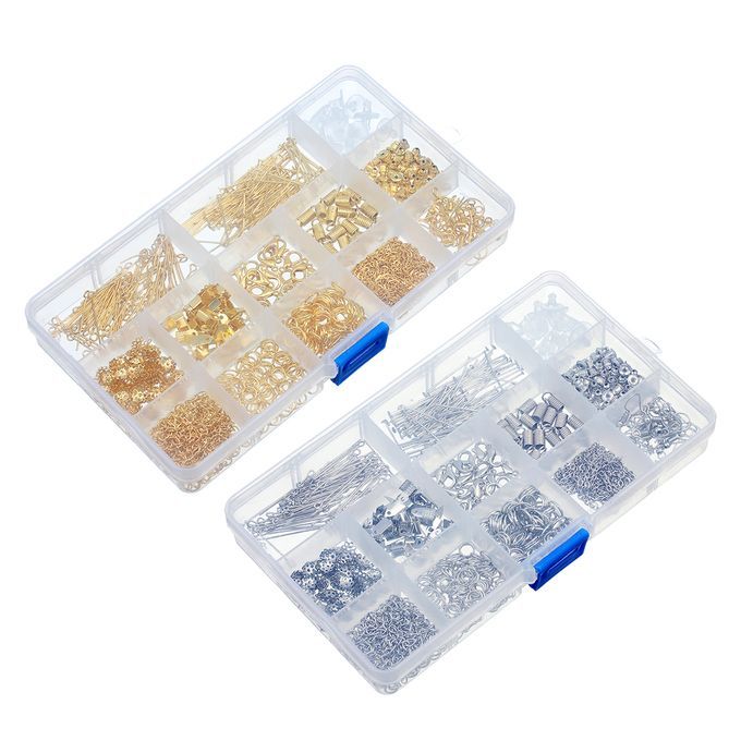2 Piece Plastic Box 100 Pieces Eye Pins 100 Pieces Head Pins 40 Pieces Earring Stoppers 200 Pieces Flower Bead Caps 80 Pieces Ribbon Clamps 40 Pieces Loster Clasps 40 Pieces Spring Ends 80 Pieces Earring Plugs 40 Pieces Extender Chains 200 Pieces 6mm Jump Rings 200 Pieces 8mm Jump Rings