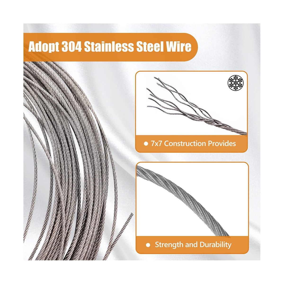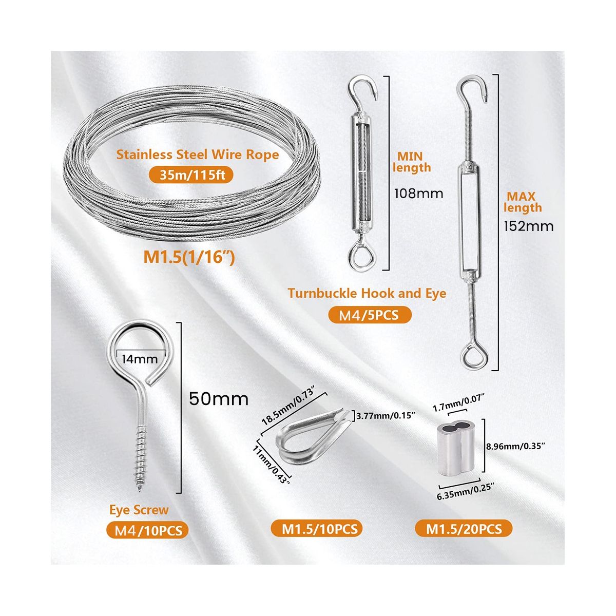 Product Specification: Wire Rope:1.5mm, 35m long;Cable Thimbles:1.5mm;Aluminum Crimping Loop Sleeves:1.5mm;M4 Eye Screw;M4 Turnbuckle Hook and Eye, 7x7 construction not easy to break and wear-resistant;Aluminum crimping loop sleeves made of high-quality aluminum,sturdy and durable,can enhance the breaking strength of cables;Steel thimble, Eye Screw, Turnbuckle hook and eye is also made of stainless steel,it is not easy to corrode even in wet or harsh environment.