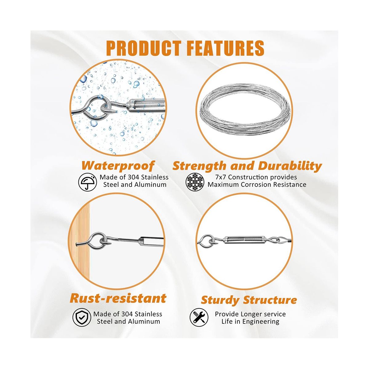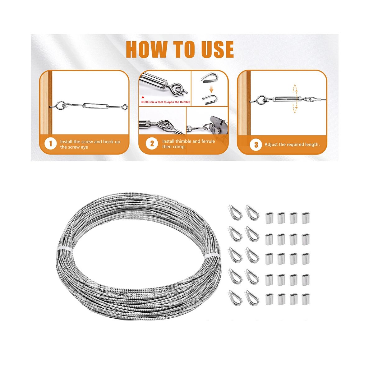 Includes wire rope,M4 eye screw,turnbuckle hook and eye,aluminum crimping loop sleeves and stainless steel thimble,one-time purchase meets your different needs.