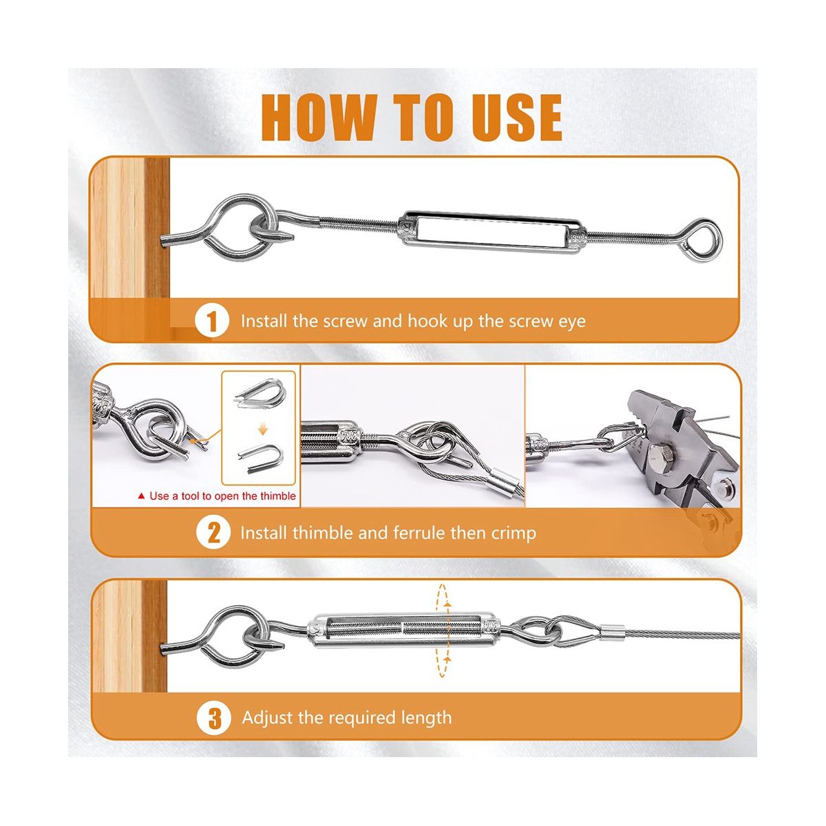Convenient to Use:Cut the desired cable length with wire cutters; 1/16inch wire rope thimbles can prevent steel wire rope wear, prolong the service life; 1/16inch wire rope crimping Loop Sleeves needs crimping tools to tighten and tighten the wire; Turnbuckle hook and eye and Eye screw can be fixed on walls, boards and where you need it, keeping the cable at a proper distance from the wall.