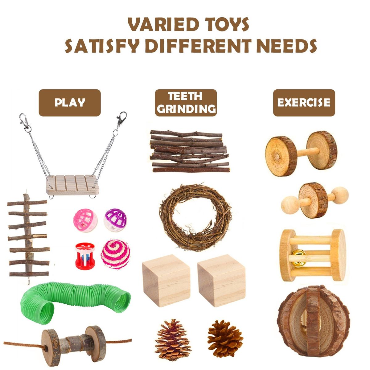Varied toys include molar-sticks, molar wreath, ladder bridge, swing, pine nuts, dumbbells, molar-cubes, bell ball, unicycle, tunnel, etc.