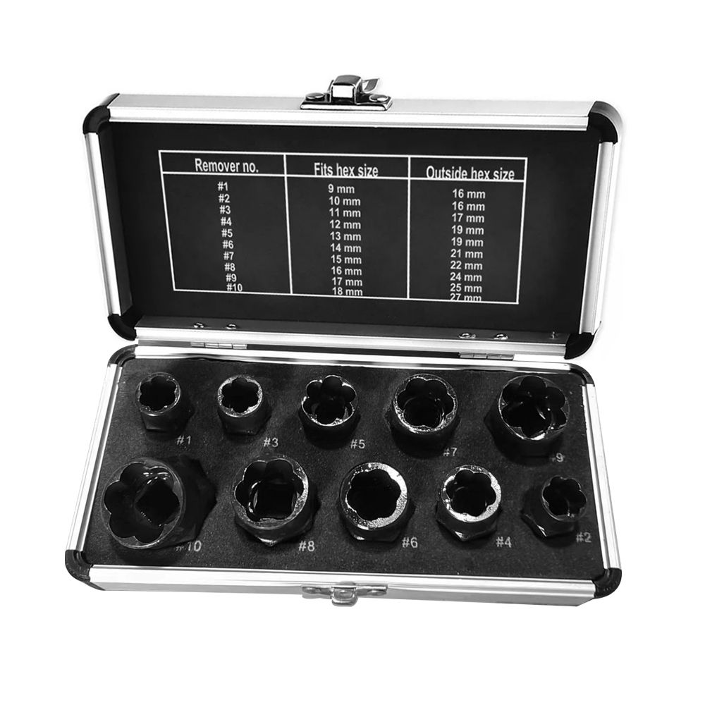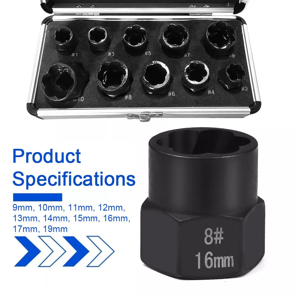 11-piece nut extractor is used to extract damaged bolts, nuts, screws, etc. It is easy to handle.