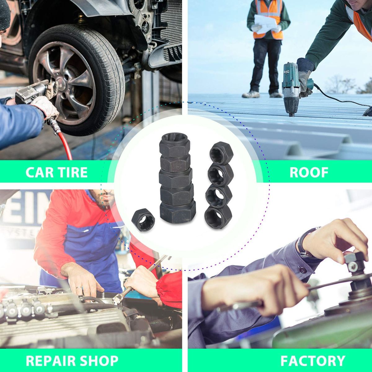 Full Equiped --- Total 10 metric standard sizes sockets including 9/10/11/12/13/14/15/16/17/19mm. Extremely effective for removing rusted, stubborn nuts, and even rounded or stripped studs especially oil drain plug. An extension included to remove the damaged fastener from the socket.