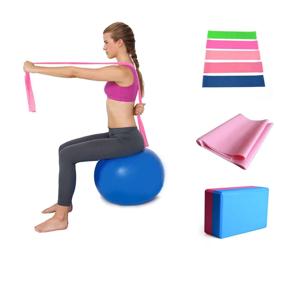 11pcs yoga kit include: 1* Yoga ball, 1* Yoga block, 1* Yoga stretching band,5* Resistance loop band,1* Small Pouch,1* Blow Pipe and 1* Air Lock.