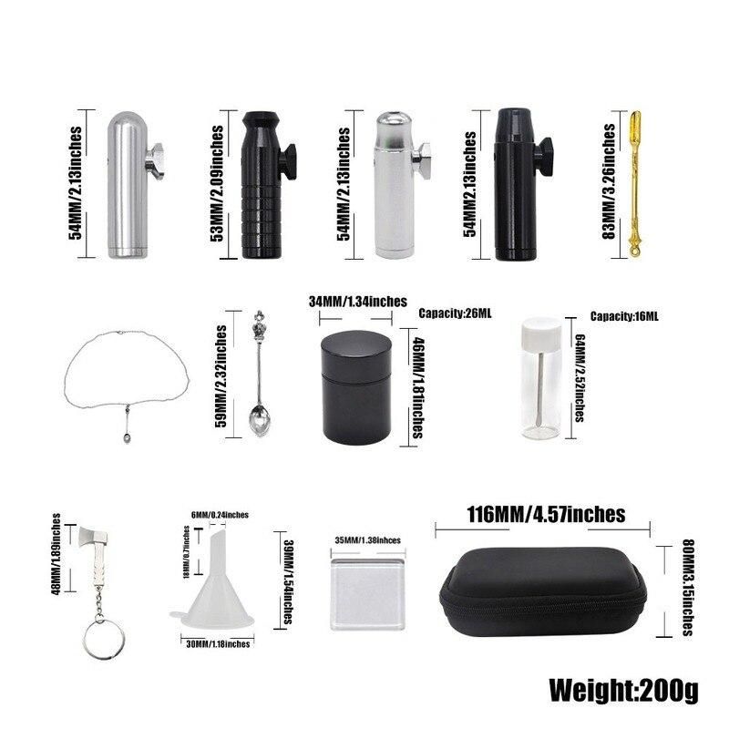 The product contains: metal snuff bottle 4 local tycoon gold cigarrette nail spoon 1 glass cigarrette oil can 1 metal storage tank 1 necklace metal cigarrette nail spoon 1 metal small axe 1 glass piece 1 small funnel 1 cloth bag Pc