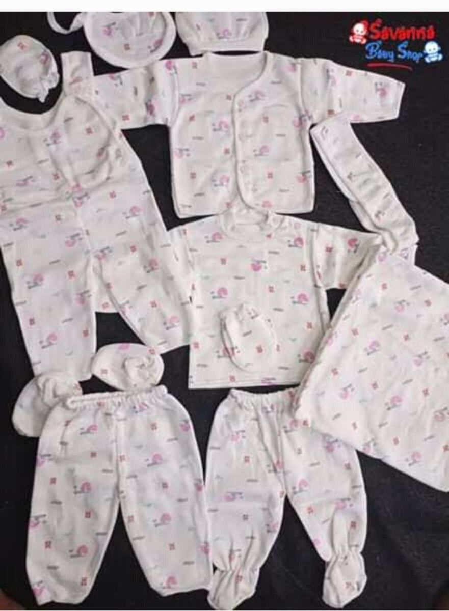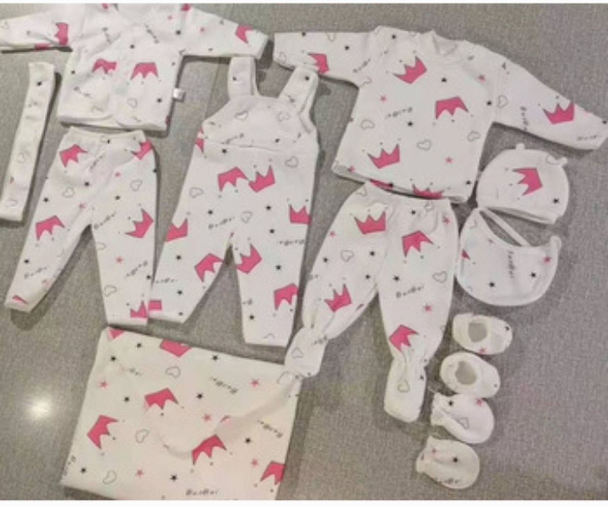 - Set has 1 full body suit, jumpsuit, 2 long sleeved tops, 2 trousers, 1 pair socks, 1 hat and 1 bib, pair of mittens