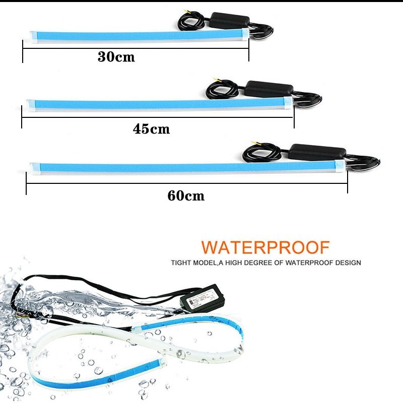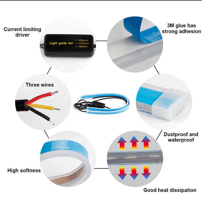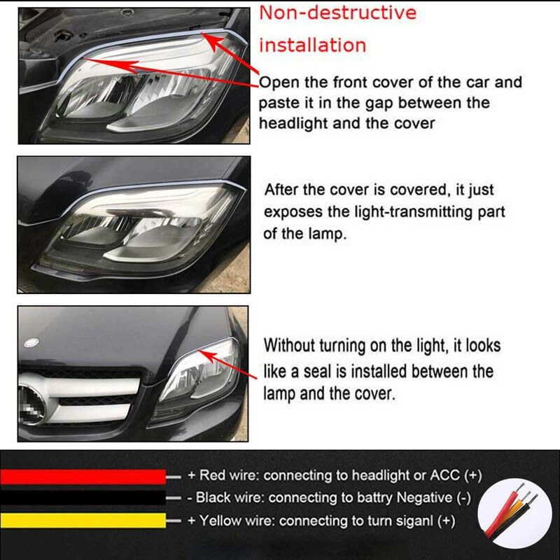 Includes (2) 30CM/45CM/60CM long water-resistant tube edge glowing dual-color LED strips with double sided tape on the back and 36" long wiring harneLight up xenon as DRL daytime running light and dynamic sequential amber flash for add-on turn signal lightThe water resistant design allows you to easily stick the LED strip outside of the head light (either above or below) without having to open the headlamp housingPerfect headlight decoration upgrade for cars trucks and SUVs to give a more unique and modern look with improved style at night!