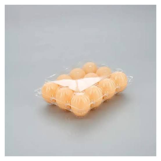 It has the cover (tray lid) joined together with it where label or company logo can be placed This transparent egg crates does not come with eggs. it is made with clear A-grade PET material. A carton is made of 300 pieces of transparent egg crates.