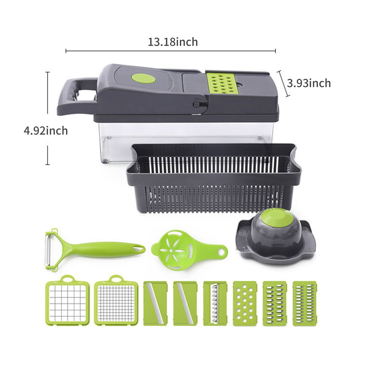 The 12 in 1 multifunctional vegetable chopper allows to slice, grate, dice, and cut a variety of vegetables and fruits in a variety of shapes and sized easily and with flexibility in a minimum time. Premium rubberized non-skid base ensures stability and safety.