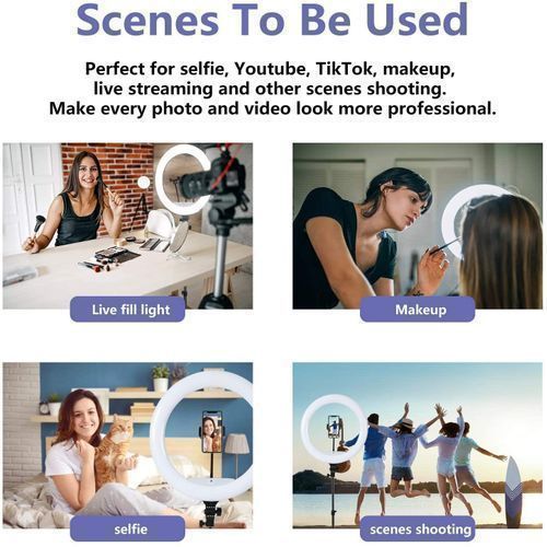 Well here it is, your solution a stylish LED ring light equipped with a phone holder, 210 cm tall, Bluetooth remote, USB cable. This dimmable led ring light has 3 color mode (white, cool white, warm white) from 1% - 100% Perfectly dimmable brightness and colors meet all your needs. Easily switch color temp to observe all kinds of makeups, avoiding awkward makeup disasters. This colorful LED ring lighting specializes in giving your face a professional look, getting a dramatic improvement, and more confidence in Selfies, Make-up, Live streaming, Beauty bloggers, Video calls, Interviews, and online meetings.