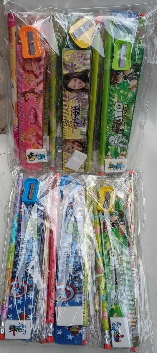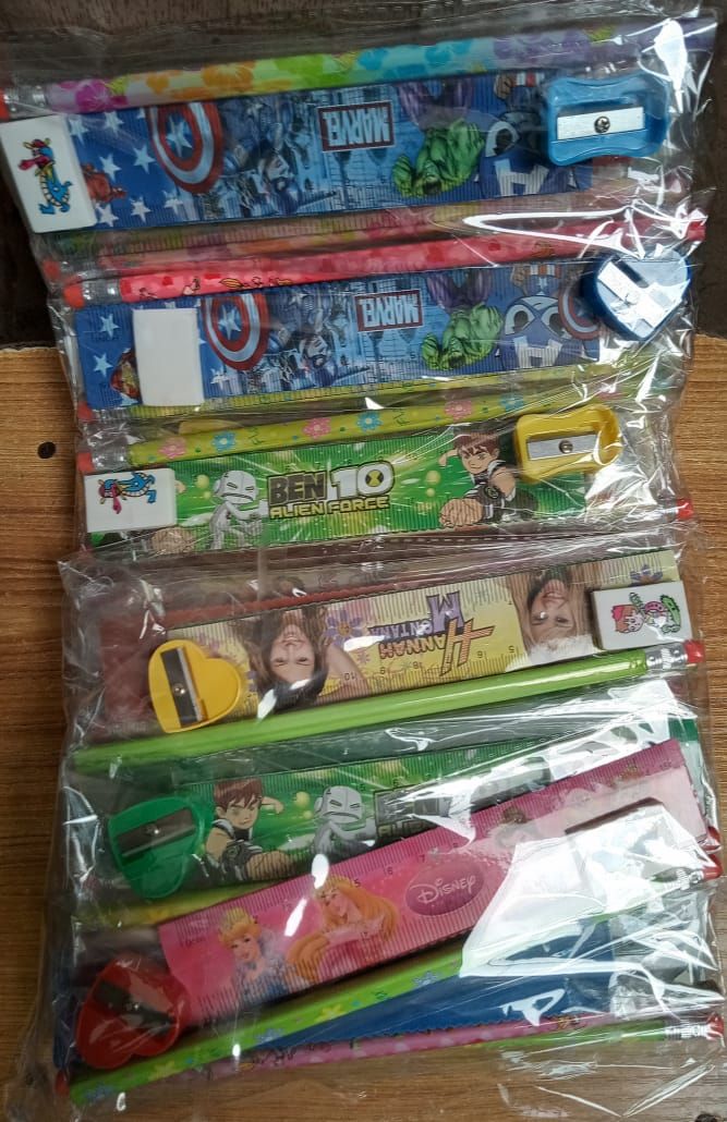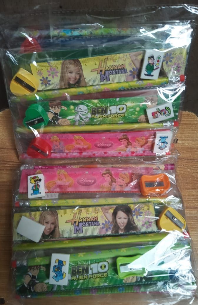 12 Kids Party Gift Pack-Writing Set Ruler+Pencil+Eraser+SharpenerThis Party gift pack comes in different colour and Mixture of Cartoon character as will be served according to available colour and Cartoon mixtureThis 12 pack is packaged for 12 children contain as follows:Ruler as children appreciate using the ruler seeing their lovely cartoon characters on it and it is colourful as they need the ruler to rule lines when writing making their write up neatIt also comes with pencil having different body cartoon characters on it as they need the pencil to write both in school and at home.Also another important gift needed for kids is the stylish cartoon shape eraser to clean error writing and sharpener to sharp their pencils when the writing mouth is broken.Comes in 12 in a pack to give 12 children.Pack-of-12-Children-Cartoon-Writing-Set