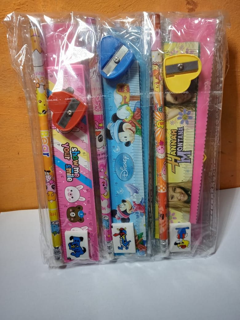 The writing set contains, a cartoon character ruler, and pencil, a fruity eraser and sharpener all in a pack