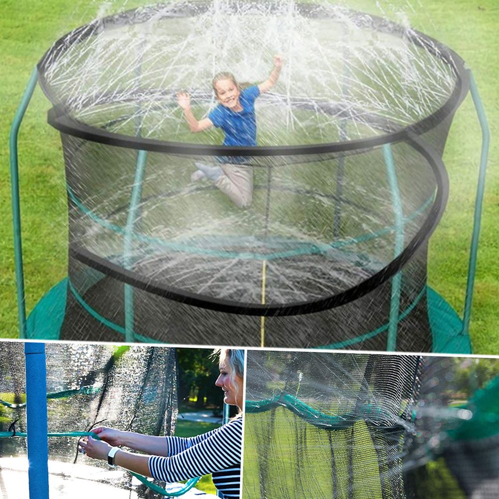 This trampoline sprinkler is the perfect gift for children in summer. It\'s time to play outdoor games in the hot summer. Prepare a gift for the children\'s party. Hang the hose on the outside of the trampoline net, connect the hose to the garden faucet, turn on the faucet, and start the children\'s party in the outdoor water park.
