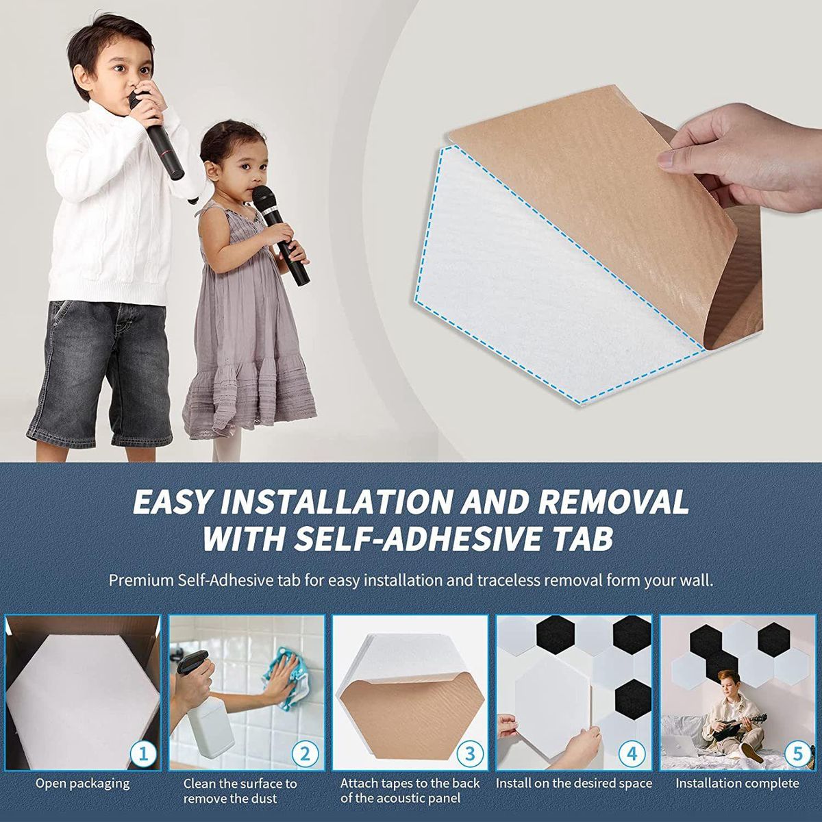 Acoustic panels have adhesive glue which is more convenient to install All you have to do is off the back film of the sound proof padding and stick each acoustic panel to the position No tools or materials are needed note do not tear off the adhesive tape on the back of the acoustic panel when peeling off the back film on the board