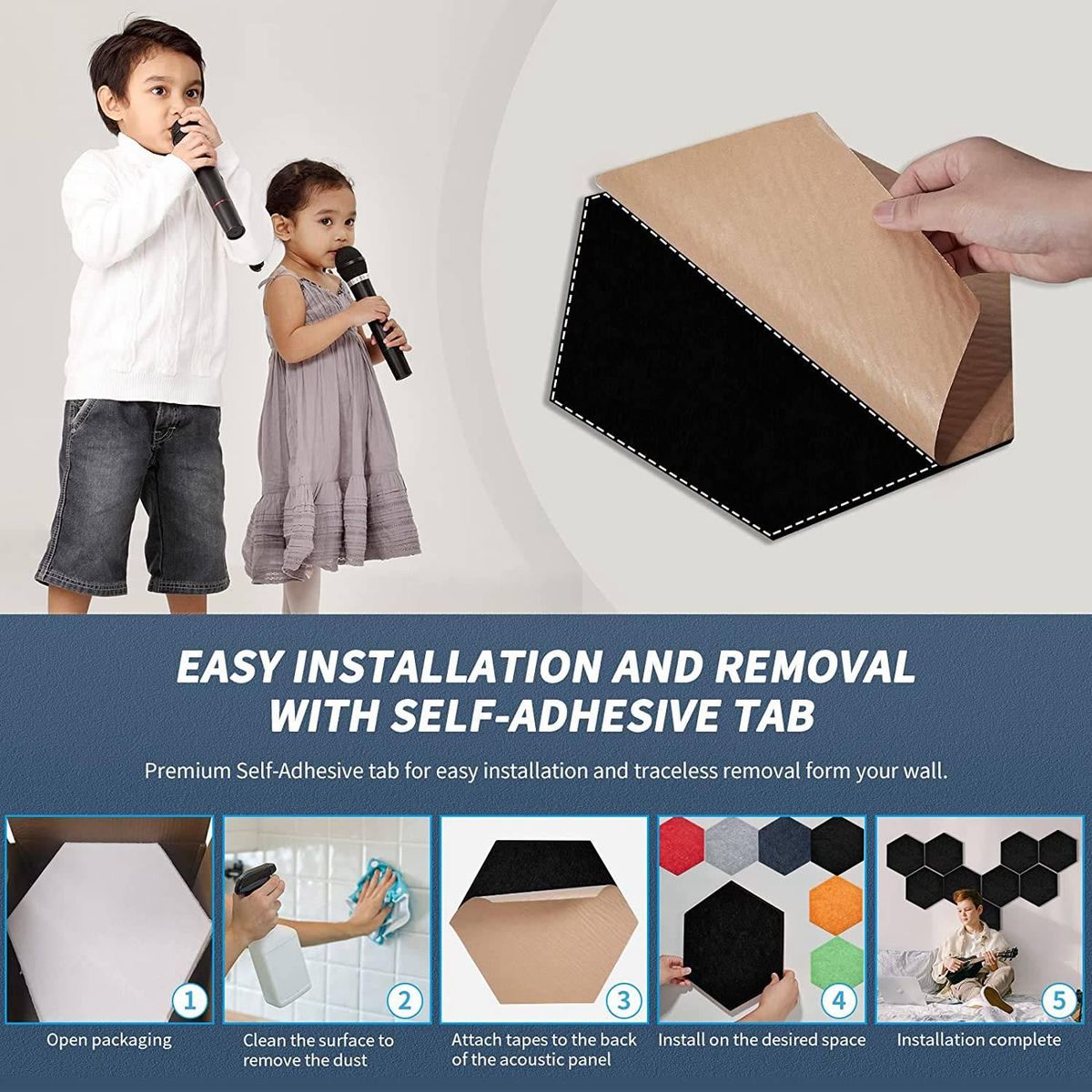 Detailed Information About The Product:Acoustic panels have adhesive glue, which is more convenient for you to install. All you have to do is peel off the back film of the sound proof padding and stick each acoustic panel to the desired position. No special tools or materials are needed! Please note: do not tear off the adhesive tape on the back of the acoustic panel, when peeling off the back film on the board.