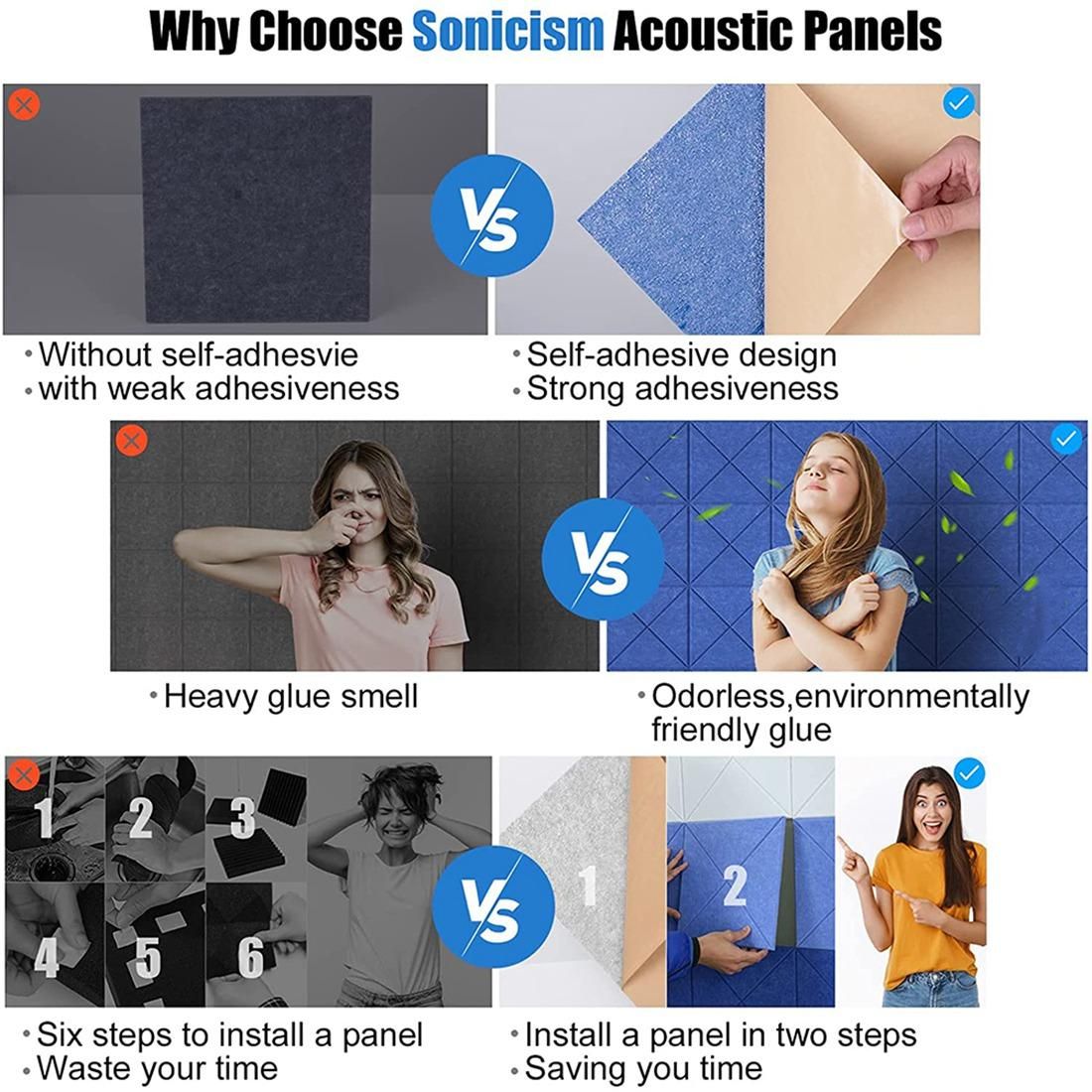 [Easy to install]: With self-adhesive design, you just need to tear off the top liner on the back and stick the sound insulation board to the wall. They can be used as acoustic covers for walls, ceilings and doors, just use glue or tape to easily connect them. Easy to shape and cut to size, easy to change without affecting performance, no special tools or materials required.