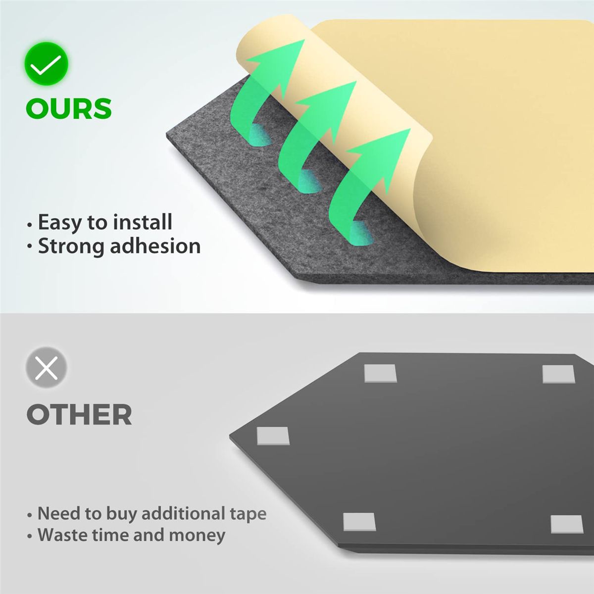 Self-Adhesive Design - The sound proof panels have double-sided tape behind themThe color of the adhesive is multicolor don't accept the specified colorEasy to InstallJust rip down the first layer of double-sided tapeyou can paste in wherever you want