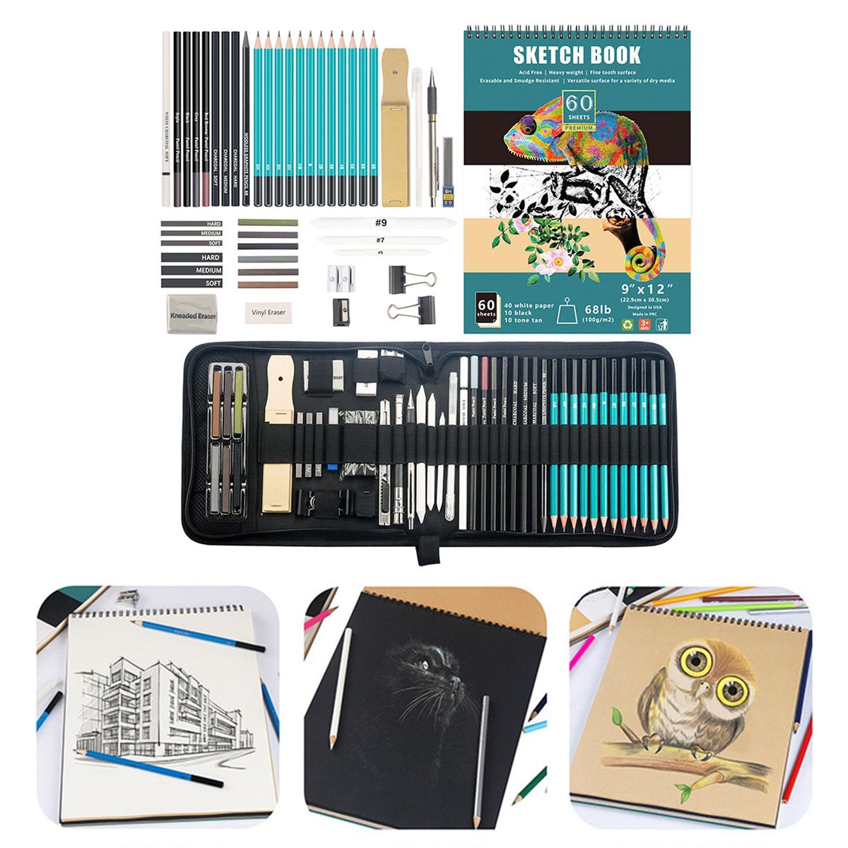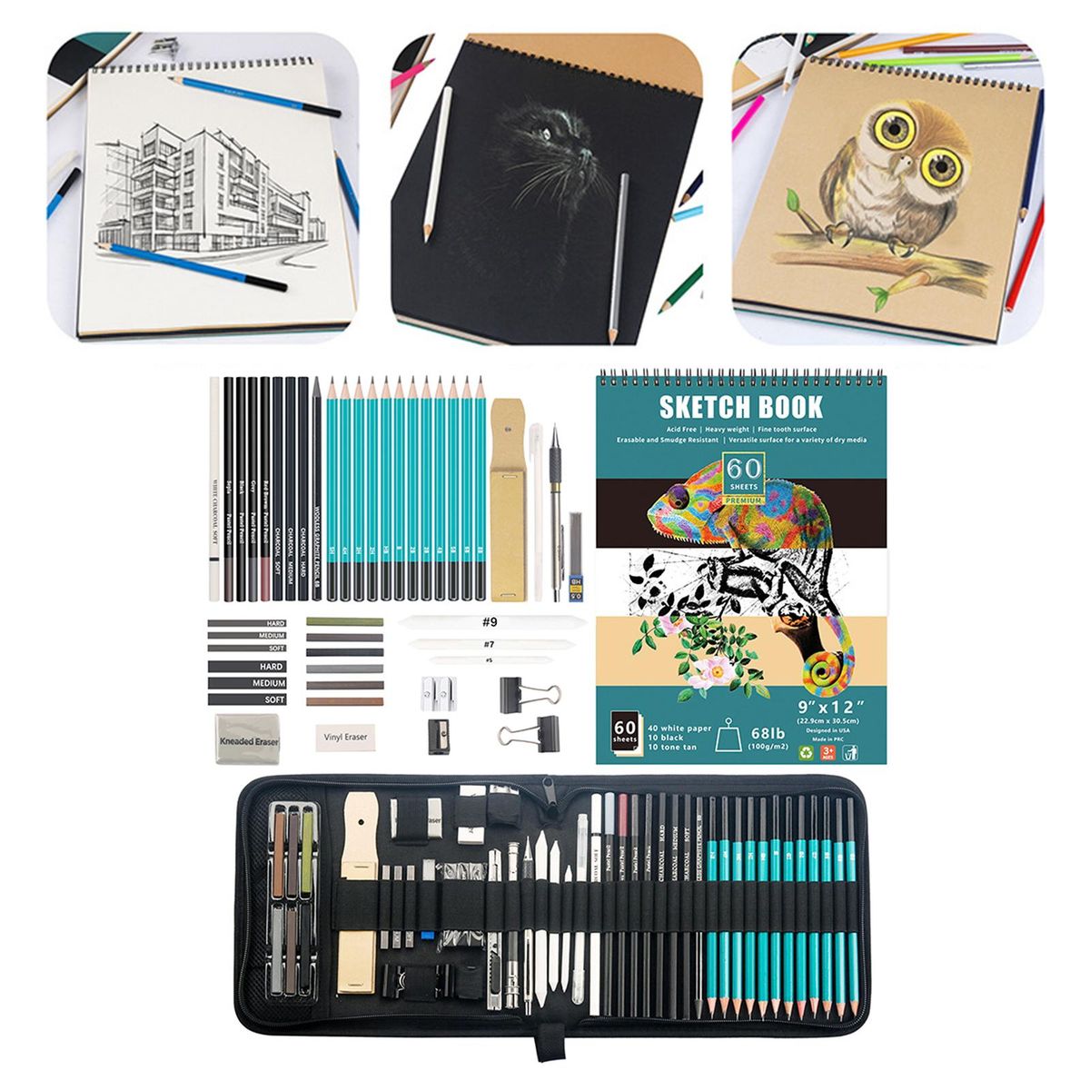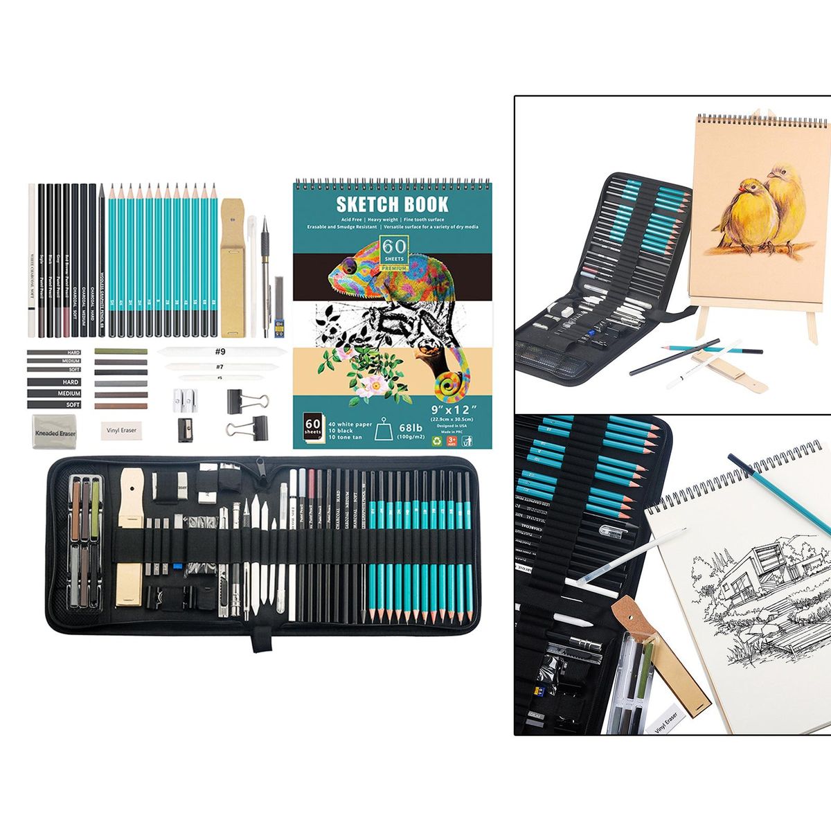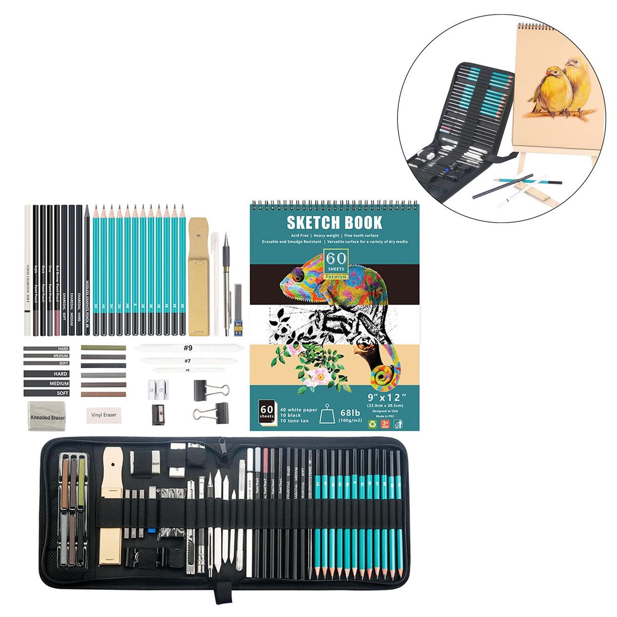 12 Pieces high-quality pencils (8B, 6B, 5B, 4B, 3B, 2B, B, , 2H, 3H, 4H, 5H),100 Pieces drawing boards,1 Piece -soft, , wood-free pencil2 Pieces 2 Pieces pencil sharpeners3 Pieces soft, medium and hard pens3 Pieces sticks of soft, medium and hard graphite3 Pieces sticks1 Piece rubbed eraser1 Piece /vinyl eraser1 Piece block3 Pieces paper mixed stumps1 Piece pencil extender1 Piece utility