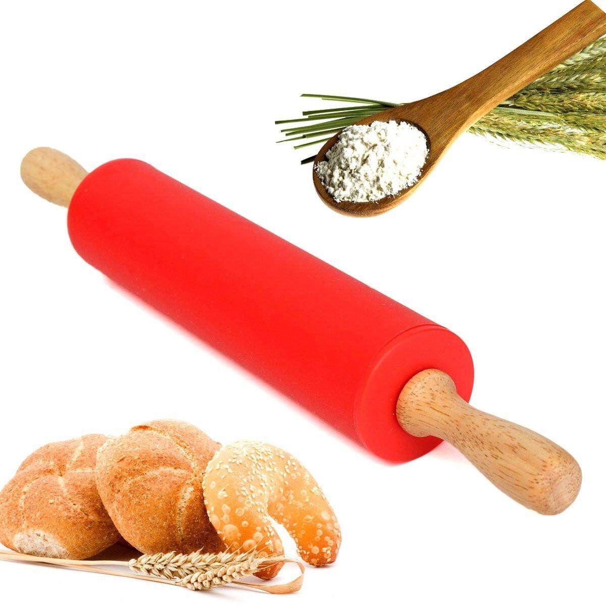 1X 12" Wooden Flour Pastry Dough Handle Roller Kitchen Silicone Rolling Pin Stick