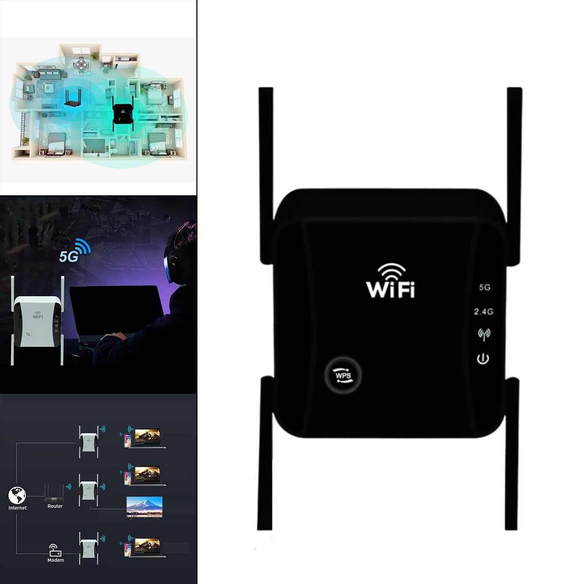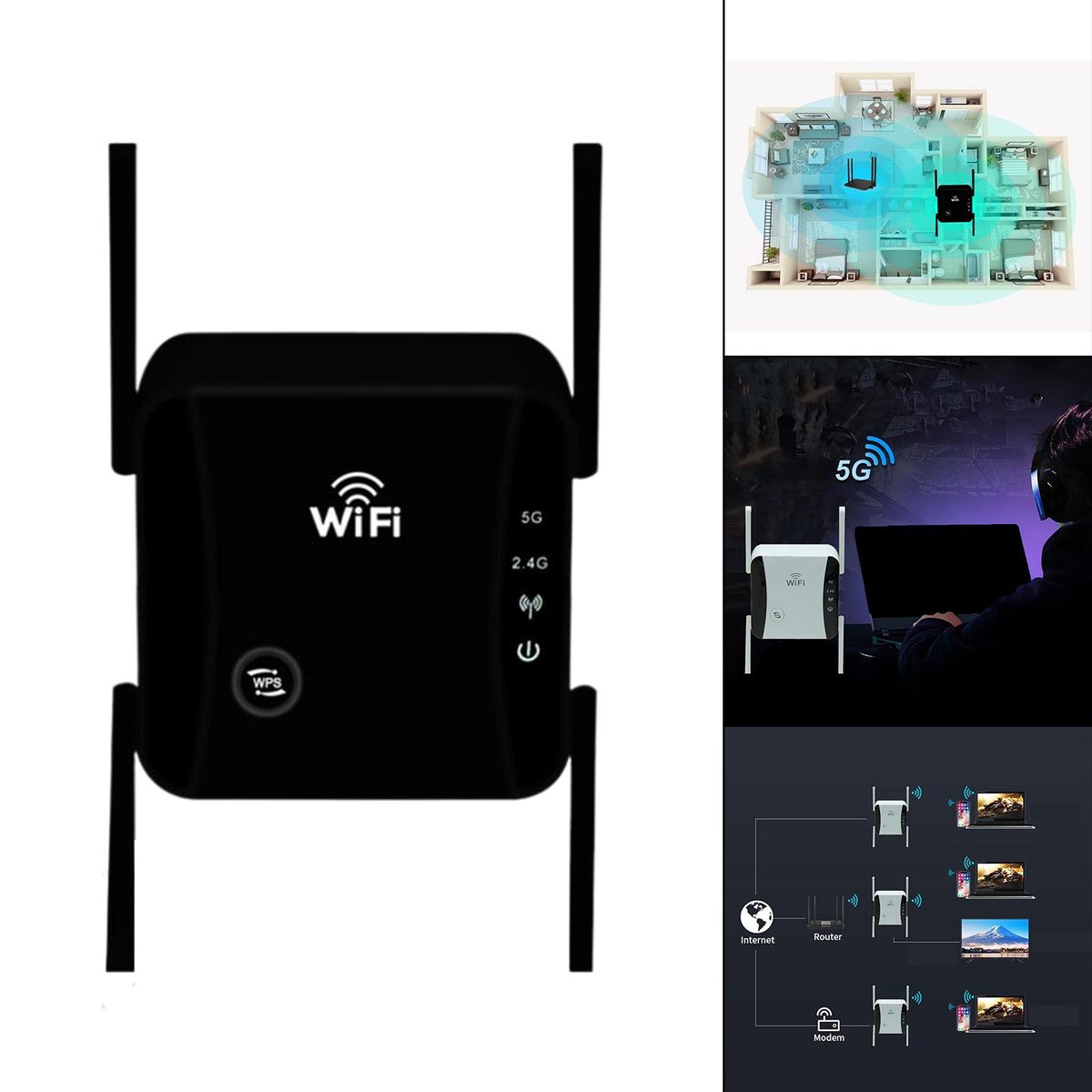 1200Mbps high-speed, support 2.4G/5.8G WiFi, 2.4G maximum speed of 300 Mbps, 5.8G maximum speed of 867Mbps, reduce the playback of high-definition movies, chat or play games when the delay or buffer.The repeater is equipped with external 4 antenna, which makes the relay signal more stable and covers your bedroom, floor, bathroom and garden.The simple and friendly operation interface eliminates cumbersome configuration, with 1x WPS/ button and indicator light.There are two working modes of relay / routing / AP/ BridgingIt can be placed between the router and the weak signal area to expand the wireless WiFi coverage.