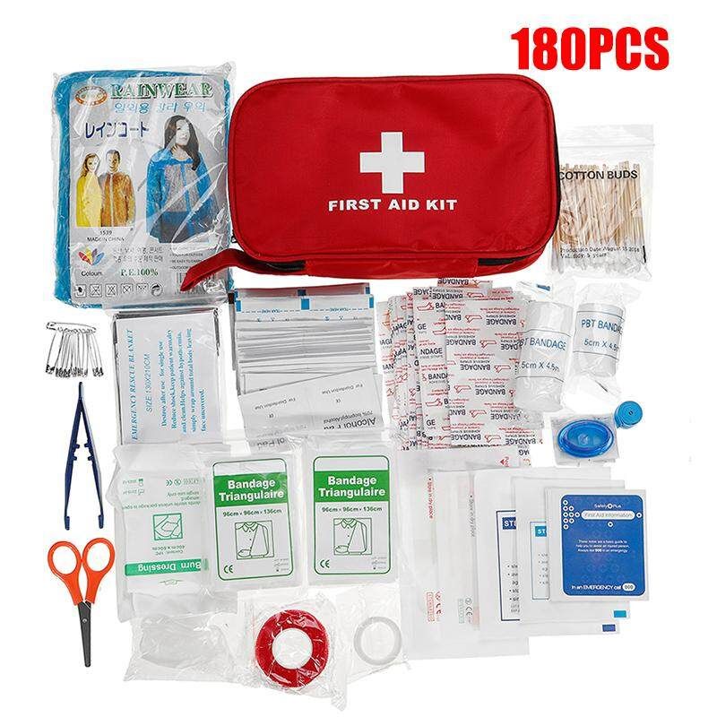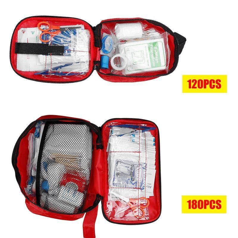 Scissor x 1 Tweezer x 1 Gauze pad x 1 Confirming bandage x 1 Adhesive tape x 1 Tourniquet x 1 prep pad x 10 Iodine pad x 4 Standard strip x 10 Round strip x 10 Small strip x 10 Sting relief prep pad x 4 Cotton buds x 50 Triangular bandage x 1 Safety pins x 10 CPR x 1 Wound dressing x 1 Wound dressing x 1 First aid guide x 1 Nylon pouch x 1 180PCS: Scissor x 1 Tweezer x 1 Sterile gauze pad x 1 Sterile gauze pad x 1 Confirming bandage x 1 Confirming bandage x 1 Adhesive tape x 1 Self-adhesive bandage x 1 Tourniquet x 1 prep pad x 30 Iodine pad x 4 Ting relief prep pad x 4 Band-aids x 30 wet wipes x 4 Soap wipes x 4 Round band-aids x 20 H shape band-aids x 2 Closure ban-aids x 2 Wound dressing x 1 Wound dressing x 1 Cotton buds x 50 Triangular bandage x 2 Safety pins x 10 CPR x 1 PVC glove x 1 Emergency blanket x 1 Rain poncho large x 1 Burn dressing x 1 First aid guide x 1 Nylon pouch x 1