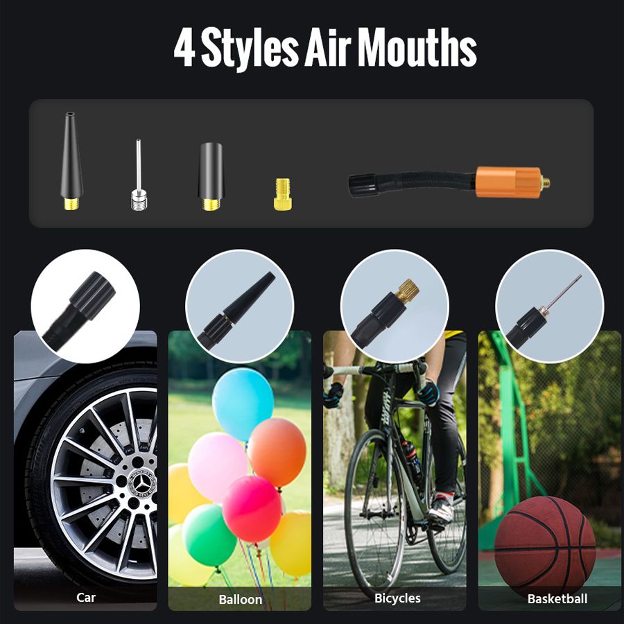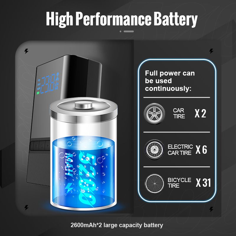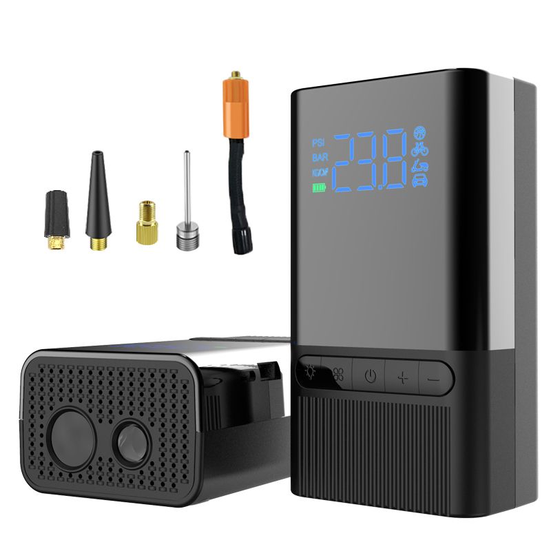 Features: 1. Auto Shut off function: stops when the preset preure is reached. 2. Bright LED light: helps you see clearly in emergency situations at night 3. Digital tire preure monitor: monitors tire preure at any time 4. Built-in lithium battery: It can be charged with (via the MICRO-USB cable) 5. Powerful, multi-purpose: Compatible with a variety of nozzles, suitable for a variety of itto inflate, like pro-bike tires, home use car tires, motorcycle tires, electric bicycle tires, balls, swimming rings, inflatable toys and other inflatables. Specification: Inflation preure range: 120 psi Accuracy: 0.2 bar Cylinder material: all aluminum alloy Aeration amount: 35L/min Screen: HD LED digital color screen Battery capacity: 5200 mAh (car-grade 18650 battery pack) Working voltage: DC+5V, 2A (input) DC+5V, 1A (output) Charging port: Micro-USB Storage temperature: -20 - 70 ℃ Trachea length: 17 cm Product size: 12.6*6.8*5 cm Product weight: 490g Note: a: When fully charged, you can inflate 4 tires for the car, or fill 2 empty tires . b: When fully charged, you can inflate 6 tires , or fill 4 empty tires . c: When fully charged, you can replenish 12 wheels of the bicycle or hit 8 empty tires.