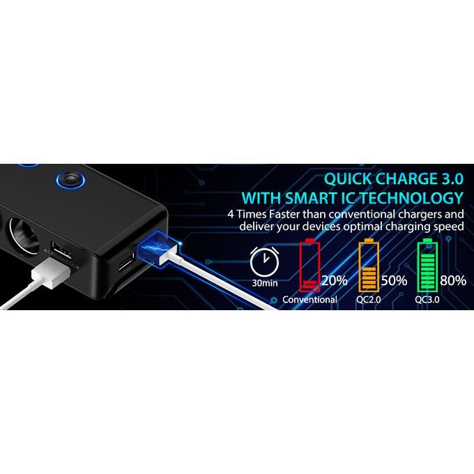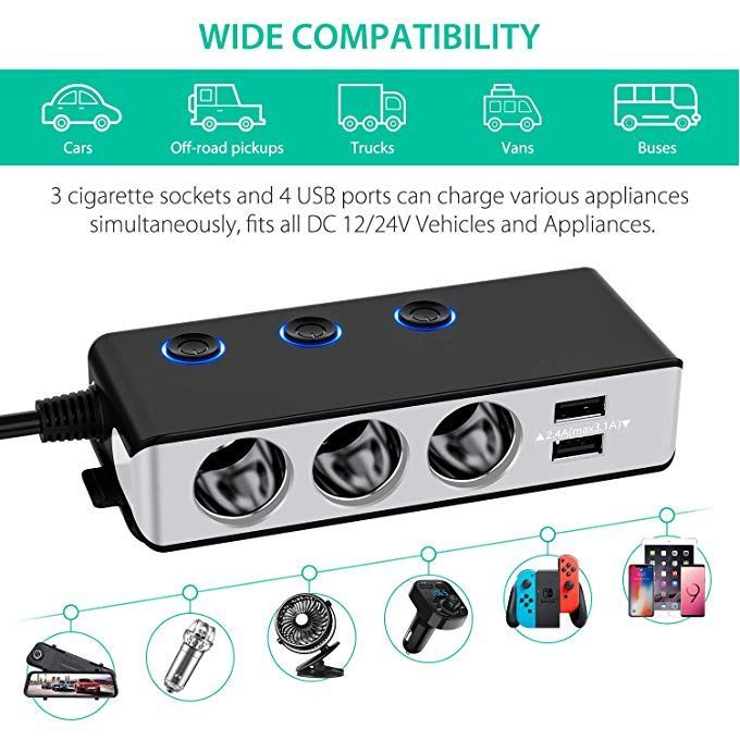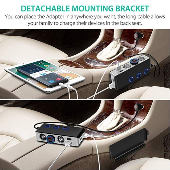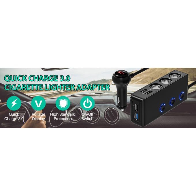 7 in 1 with Quick Charge Car Charger car power splitter made of high-impact ABS and PCBA material, which is durable and safety. Designed with the sticky detachable mount, you can fit the car adapter in anywhere you want!We upgraded a QC3.0 USB Port which can provide a 4x faster speed than conventional chargersprovide a total output power of up to 120W, excellent for your GPS, dashcam, cooler box, etc.Smart IC technology intelligently detects your devices to deliver its fastest possible charging speedThe LED display helps monitor the voltage of your car battery, when the voltage is under 11.6V, warning with flashing numberExcept the main switch on the top of plug, we added the independent switch to control each cigarette socketMain Plug Switch & Independent Sockets SwitchSplitter can control all Sockets&Ports with the plug button,every sockets also assign an independent switch.Avoid plugging & unplugging every times, simply and more healthy to your devices.High Safety StandardsThe Sockets built in PPTC replaceable 10A fuse for better protecting your devices from over-voltage, over-heating, over-loading or short-circuiting. Certified by RoHS, CE & FCC.Flexible Mounting BracketAdding a sticky detachable mount can keep the Car Charger Adapter in place or be separated. Help the Adapter fixed in the right position avoid falling and also allow charging the devices in the back seat when you need.