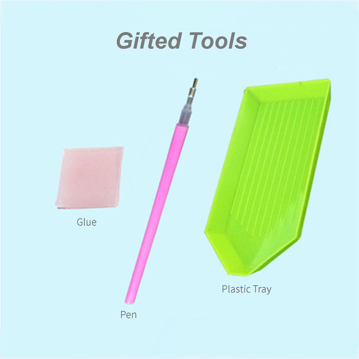 2. Assist tools are included: a pen, a plastic tray and a glue.