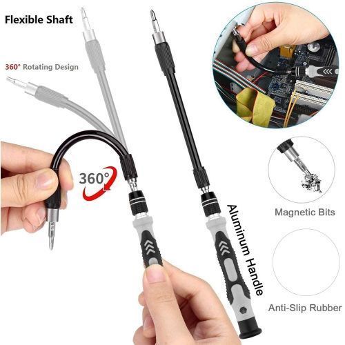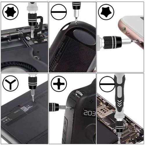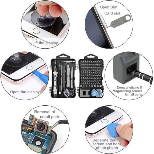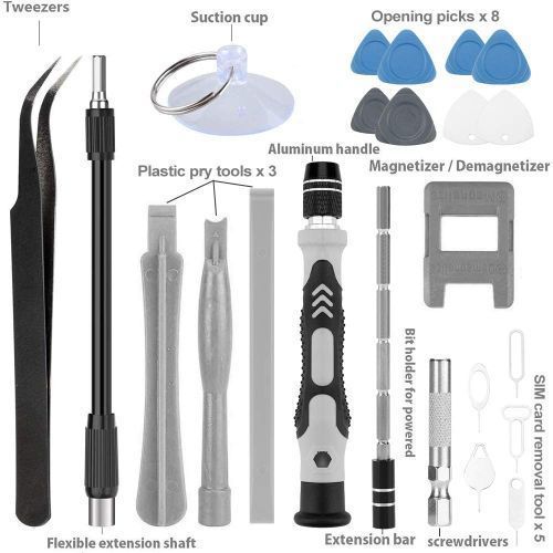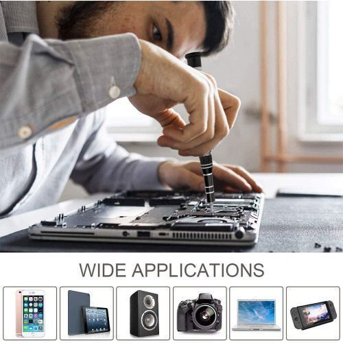 Precision screwdriver set can be used for household appliances such as TV, air conditioner, fan, refrigerator, car repair, etc. It can also be used for the disassembly and maintenance of mobile phones, digital cameras, watches, glasses, laptops and nintendo game console. Meeting every customer's daily needs is the best option for your tool kit Professional 122 in 1 Multi-Magnetic Screwdriver Set Interchangeable Precise Manual Tool Set including Magnetic Handle, Extension Rod, Short Shank, Extension Rod aluminum alloy, tool box, tweezers, phone pin, suction cup, bracts, crowbar, 98pcs screw bits, magnetizer/demagnetizer, etcThe chrome vanadium head has a hardness of 55-60HRC, could use for long time. The screwdriver head is magnetic, with good quality assurance and operabilityErgonomic soft-touch screwdrivers for the most comfortable experience possible. Compact material, anti-static handle Packed with a storage case that provides full protection. It is pocket-friendly and easy to carry, ideal for home, work, business, travel or shopping