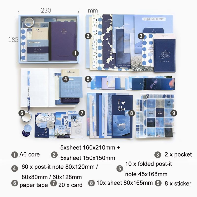 5.122pcs/set specifications: A6 core + 5 x sheet 160 x 210mm + 5 x sheet 150x 150mm + 2 x pocket + 60 x post-it note 80x120mm/80x80mm/60x128mm + 10 x folded post-it note 45x168mm + paper tape + 20 x card + 10x sheet 80x165mm + 8 x sticker