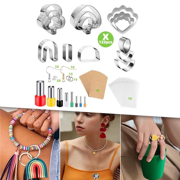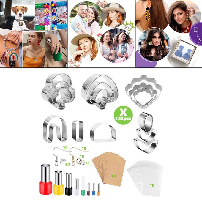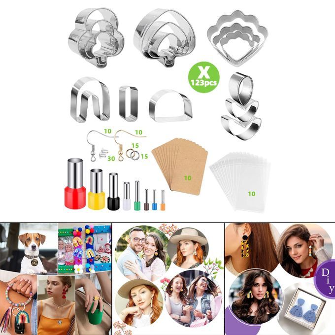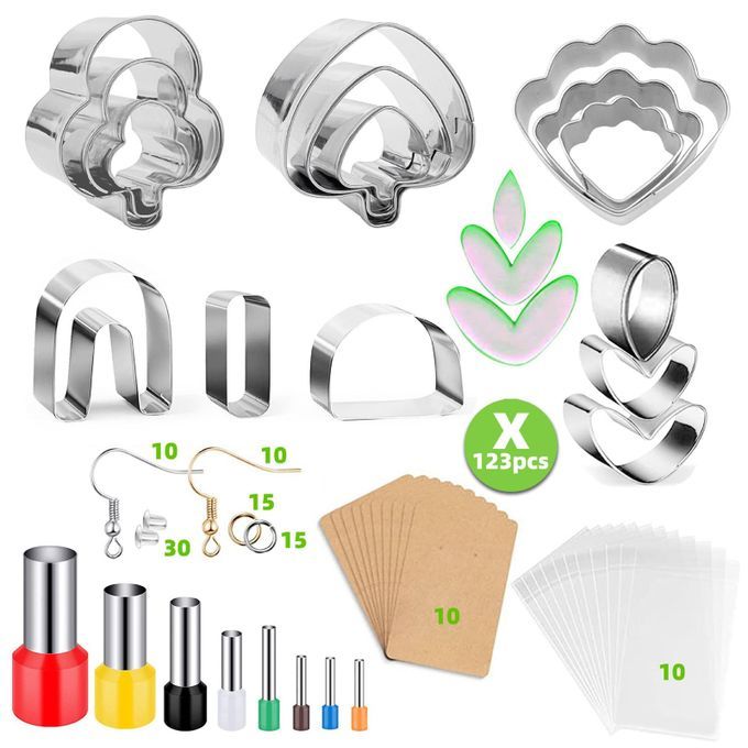 Polymer Clay Cutters Set: with polymer clay earring cutters, Circle Shape Cutters, earring cards and self sealing bags,earring hooks etc, total 123 Pieces accessories