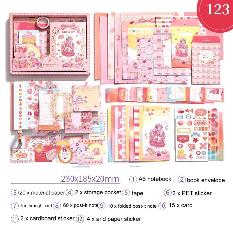 7.123pcs/set specification: A6 notebook + book envelope + 20 x material paper + 2 x storage pocket + tape + 2 x PET sticker + 5 x through card + 60 x post-it note + 10 x folded post-it note + 15 x card + 2 x cardboard sticker + 4 x and paper sticker