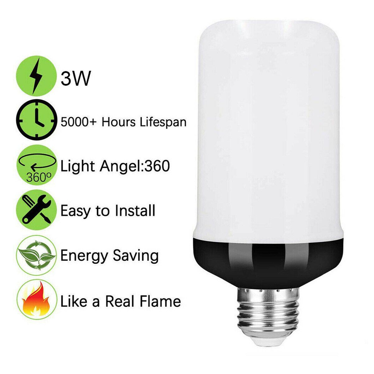 Flickering mode, Breathing mode, General lighting,Gravity Mode.LED flame effect lamp has flame simulation mode, breathing mode, general light mode and gravity sensing mode. The mode of the flame bulb effect can be changed by turning the on after each off. No matter which direction your luminaire is in, our flame will always travel from bottom to top like a real due to the gravity sensor.