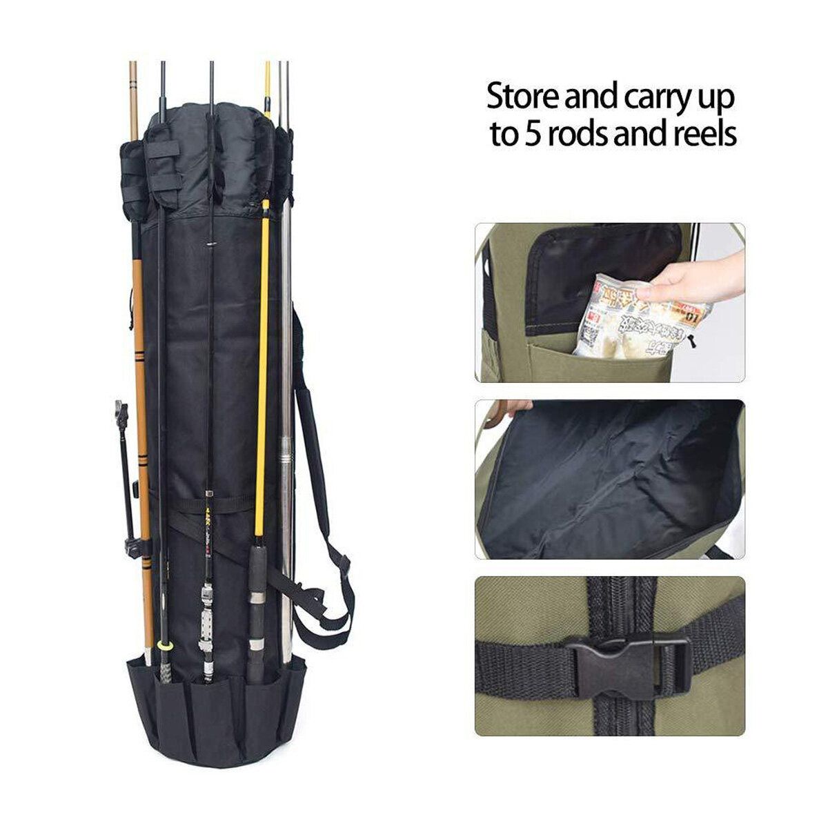- Store and carry up to 5 rods and reels in the pockets on the outside of the bag.
