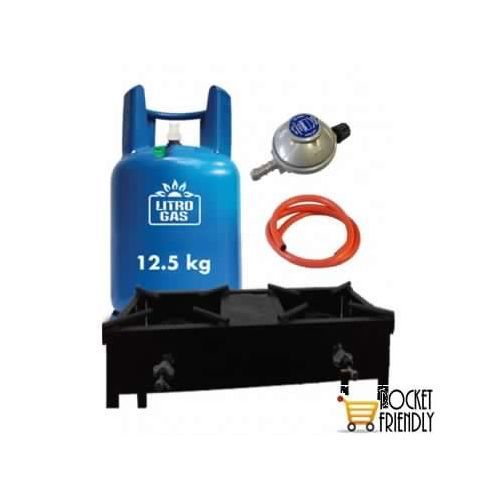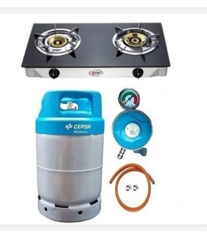 Cepsa 12.5kg Gas Cylinder With Rock View Glass Top Double Burner, Metered Regulator, Hose & Clips - Blue Cap