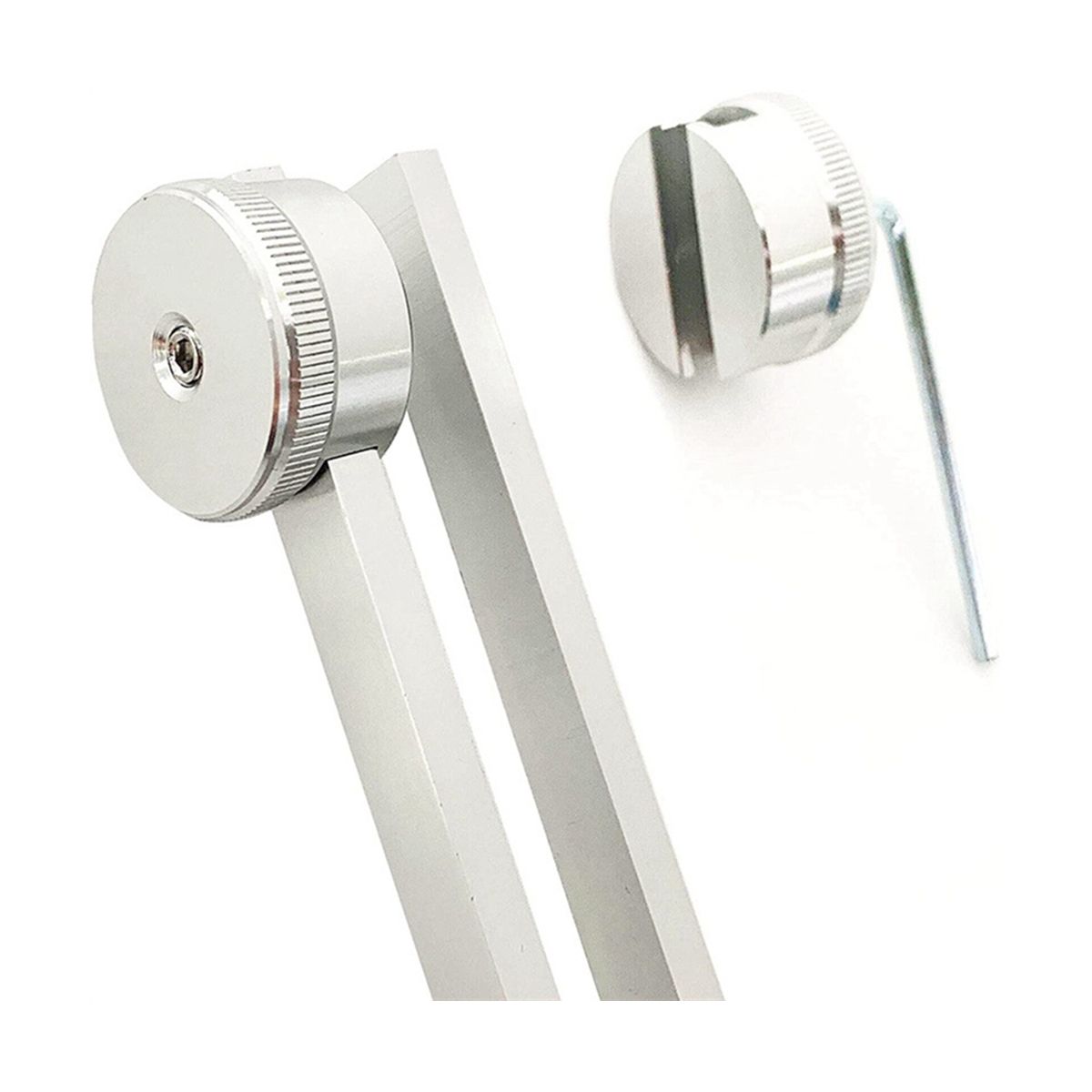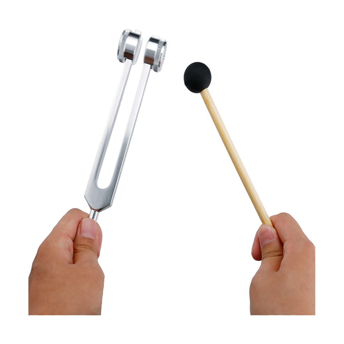 For listening, hold the 128 Tuner by the stem and gently tap the weights on your knees or tapping pad. Bring the tuning fork(s) to your ears and adjust the distance by tone. Hold one fork about an inch from your left ear and one an inch from to the right ear. This creates a long sustained pitch