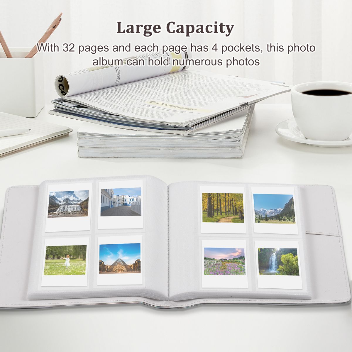 【Large Capacity】This photo album contains 32 pages and each page has 4 pockets, can hold totally 128pcs photos. Opens like a book for easy viewing. Side loading pockets prevent photos from spilling out and keeps them safe during transportation.
