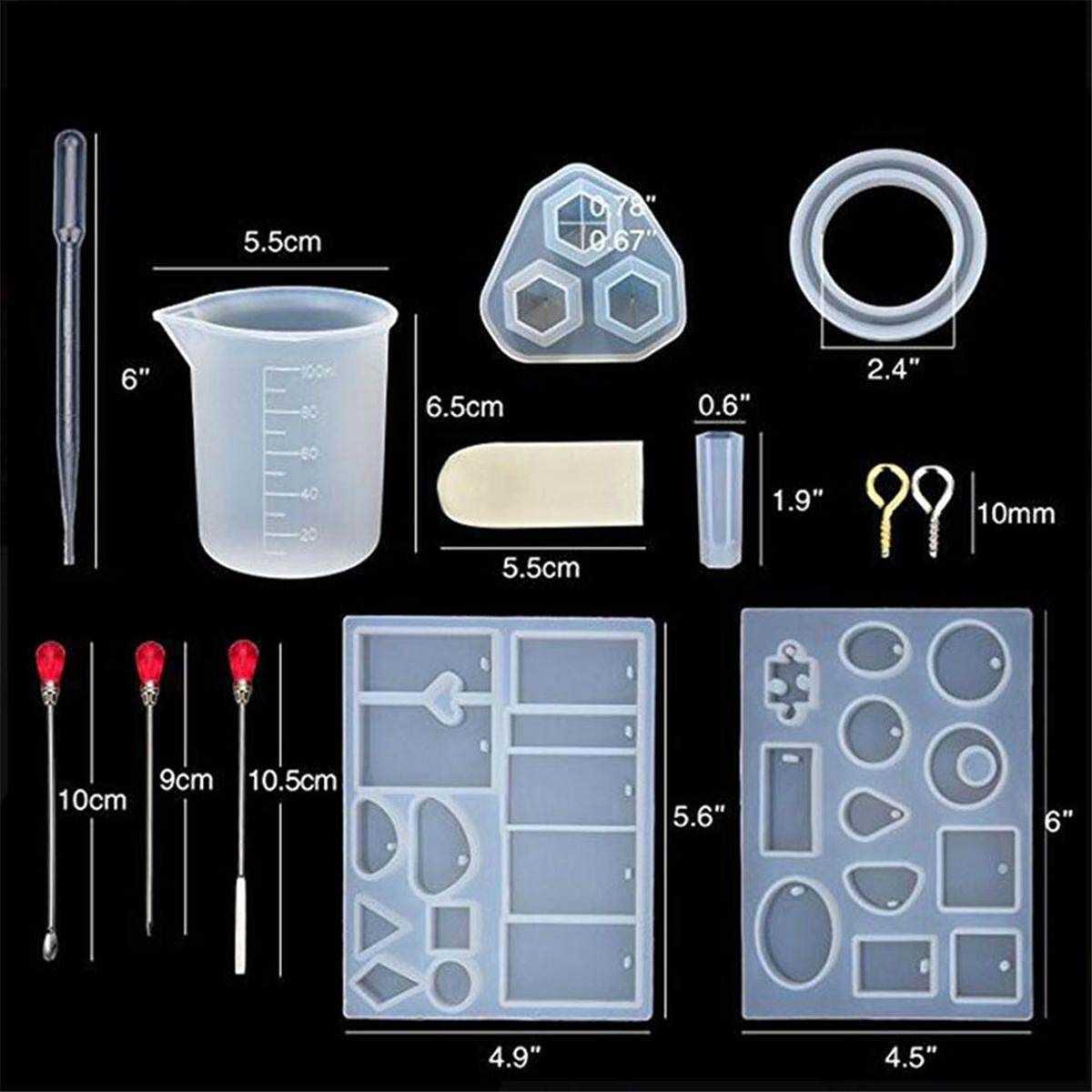 128Pcs Resin Casting Molds Jewelry Making Silicone Mould Metal Pendant Craft Kit Description: Type:Silicone Mold Material: Silicone+plastic+stainless steel Main : Clear Quantity:128Pcs/Set Package Included: 1 x Plastic Stirrers 3 x Stir Bar 5 x Plastic Droppers 9 x Jewelry Molds (assorted designs) 10 x Finger Sleeves 50 x Gold Screw Eye Pins 50 x Silver Screw Eye Pins Features: 100% . Includes jewelry molds, screw eye pins, stirrersand dropper. Durable and easy to use. Easy making and easy out. Jewelry molds are flexible, resistant to tearing. Suitable for craft projects making and jewellery DIY, make pendants, earrings or jewelry items, you can also add some flowers, glitter, colors to make your own crafts. Jewelry Making Steps: -1.Smear the mold release agent on the silicone mold. -2.Hit epoxy by boiled water,but can't touch the water. -3.Mix the epoxy to suitable ratio. -4.Mix toner into the epoxy. -5.Pour the epoxy into mold. -6.Wait until epoxy curing. Notice: 1.The real of the item may be slightly different from the pictures on website caused by many factors such as brightness of your and light brightness. 2.Please allow slight deviation for the measurement data. 3.Please allow 1-3mm error. Ifyouhaveanyquestions,pleasecontactus. Wishyouhaveahappyshoppingtime!