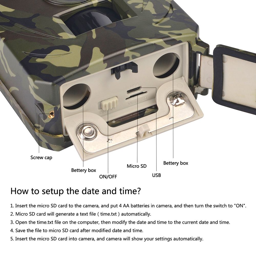 2. Before operating the camera, install 4 AA batteries for power supply, and a TF card for storing future-captured images and videos. (Batteries and TF card are not included here)