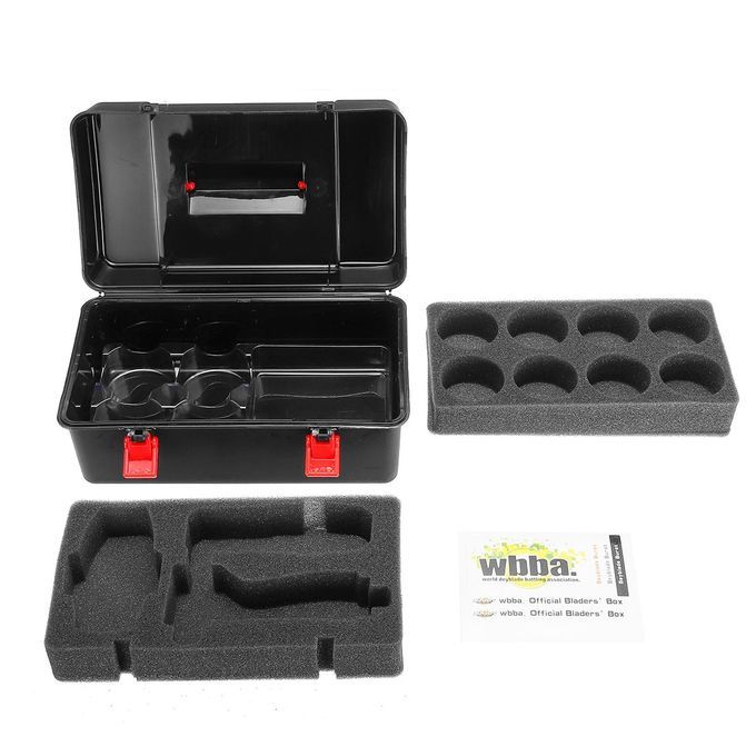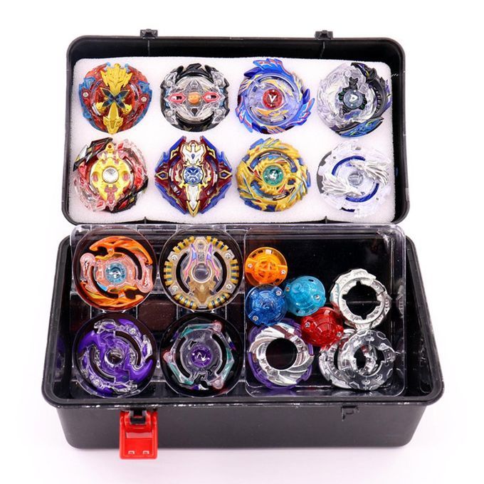 12 x Spinning Tops 1 x Handle 3 x Launchers 1 x Storage Box