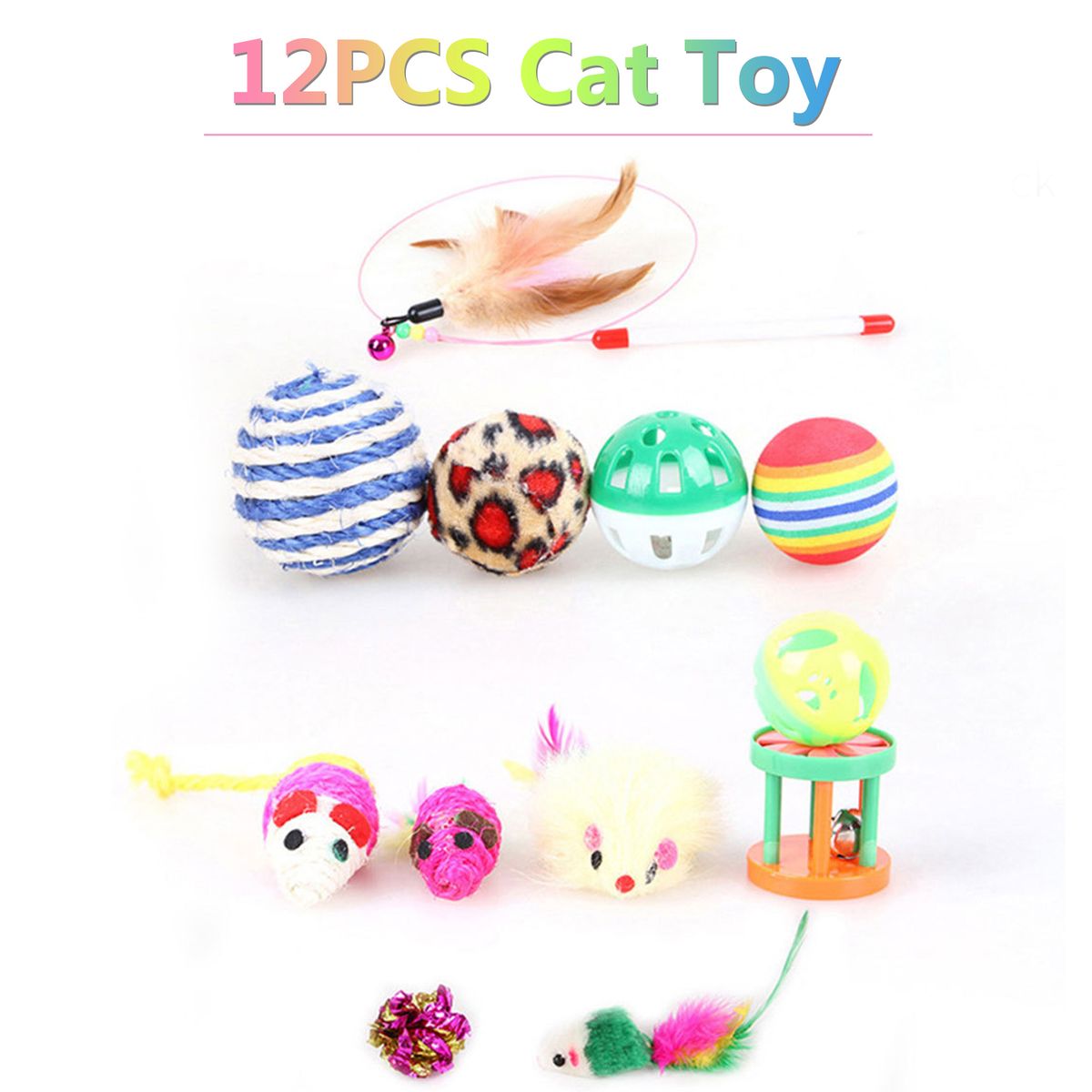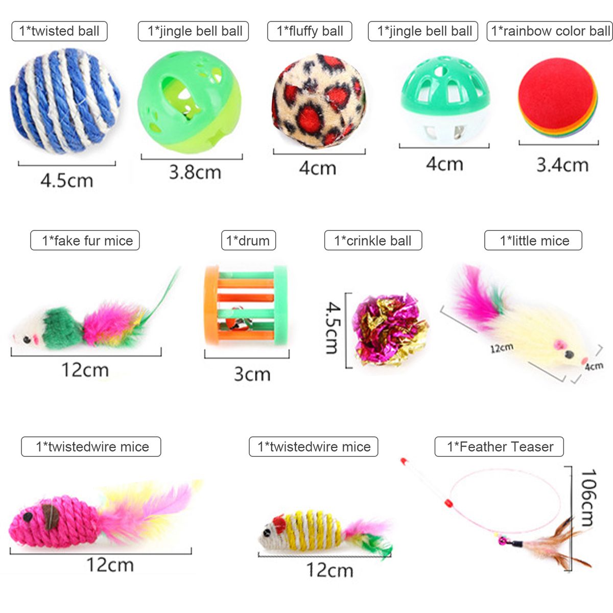 Super Value Cat Animals Toys Set: 2pcs bell ball,1pcs rainbow ball,1pcs plush ball, 1pcs twine ball, 1pcs drums, 1pcs crinkle ball, 4pcs mouses and a feather teaser. An ideal gift for cats of all ages. Great worth gifts for birthday or festival. Playing with cats helps to enhance the relationship between each other as well.