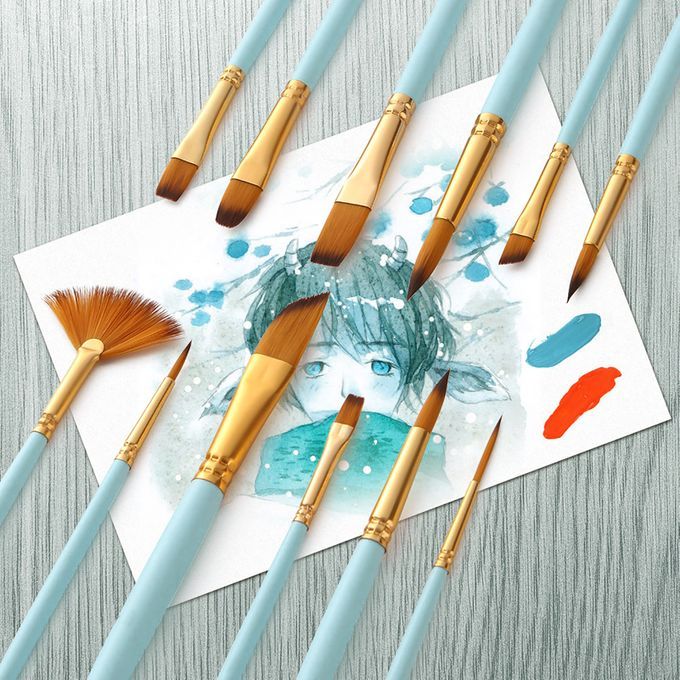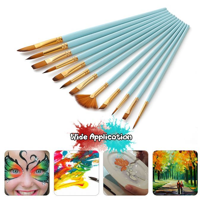 Widely Application: 12pcs paintbrush set with nylon hair, is widely used for beginners, students and artists alike to paint watercolor, acrylic, gouaches and oil, and body, nail and face,etc. Enjoy a sense of achievement and joy through painting.Anti-shedding Hairs: The anti-rust & anti-split nickel ferrules are attached well to the brushes in order that the synthetic taklon hair of the brushes will not loosen and shed when you are creating your artwork.Painting Every Stroke You Needed: Double color nylon hairs hold onto their shape after use and sturdy wooden handles with comfortable handling and control allow for smooth strokes, which makes the brushes work great at painting detailed areas.Superior Quality: Light wooden handle, coated with shiny and metallic looking blue paint, is eco-friendly and will not be bent or broken even with long-term use. High quality synthetic brush hairs stay soft and flexible after cleaning.Easy Clean: Gently cleanse the brushes with warm soapy water and rinse them; With proper maintenance, the brushes will hold their shape and allow for long time of use.