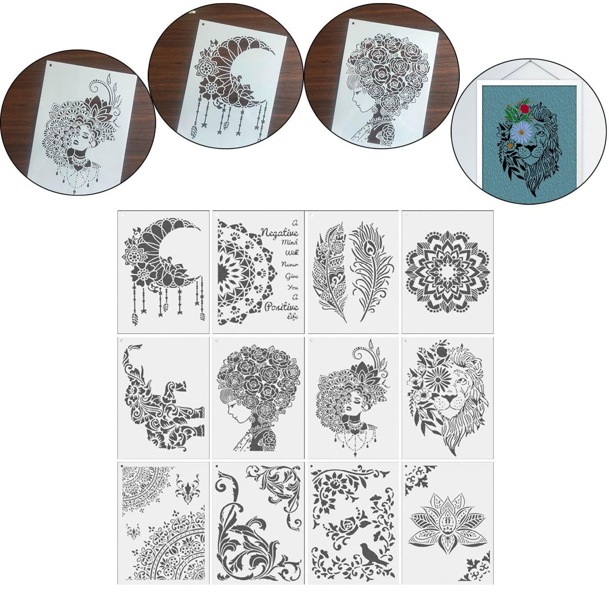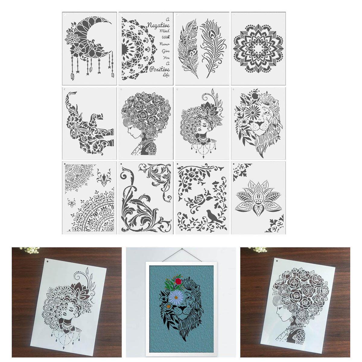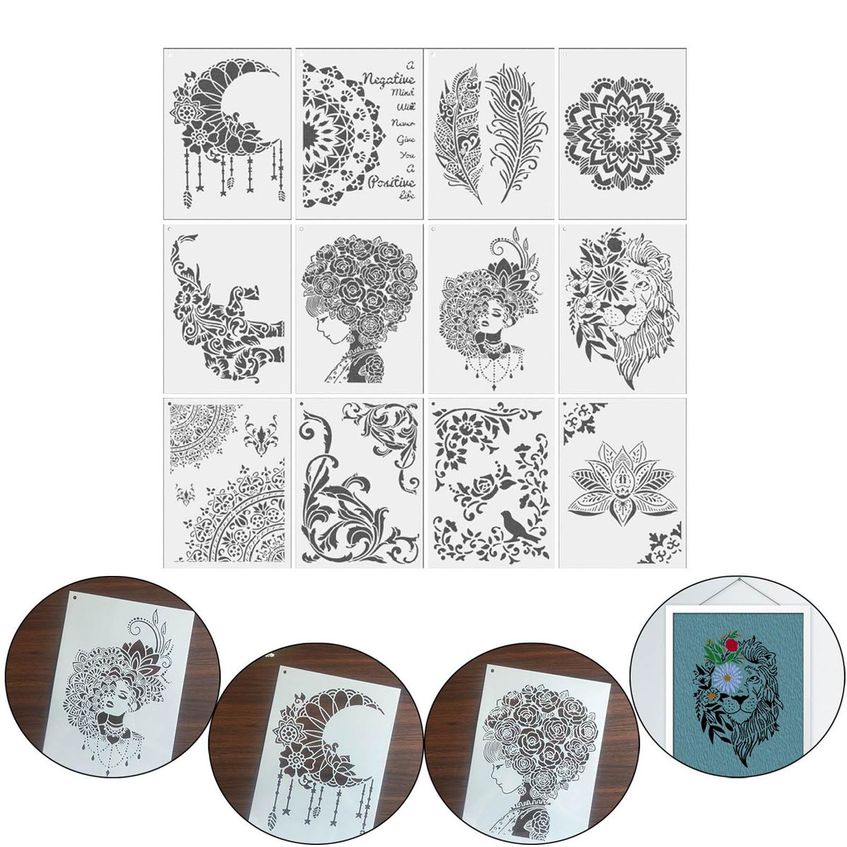 PACKAGE INCLUDES : 12Pieces different styles mandala stencils template. Quantity and size are enough for your daily DIY use. Great large stencil template set for crafts and diy projects supplies!MATERIAL : This mandala Stencils are made of reusable PET with good flexibility and durability, Don't worry about them getting dirty, they are washable.STENCIL SIZE : Each mandala stencil is A4 size 8.27 x 11.69inches, Color:White. Flexible and not sharp, cannot cut the skin. EASY TO USE : This mandala stencil template can help you save a lot and trouble when creating mandala dot painting or other crafts.WIDE APPICATION : These mandala stencils can be applied to most flat surfaces including furniture, stones ,wood,fabrics, metal,canvas, rocks,tiles, floors, cabinet, wedding crafts, furniture, tray tables , etc.