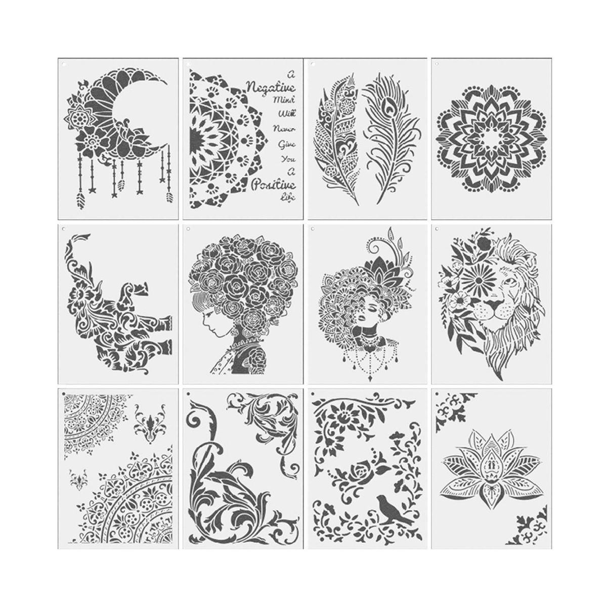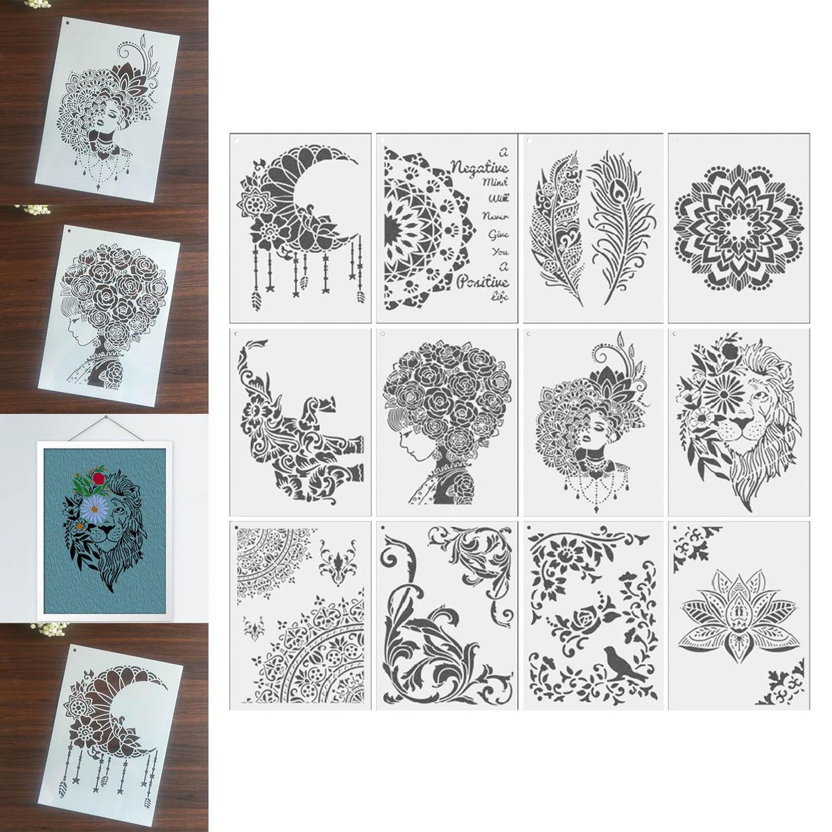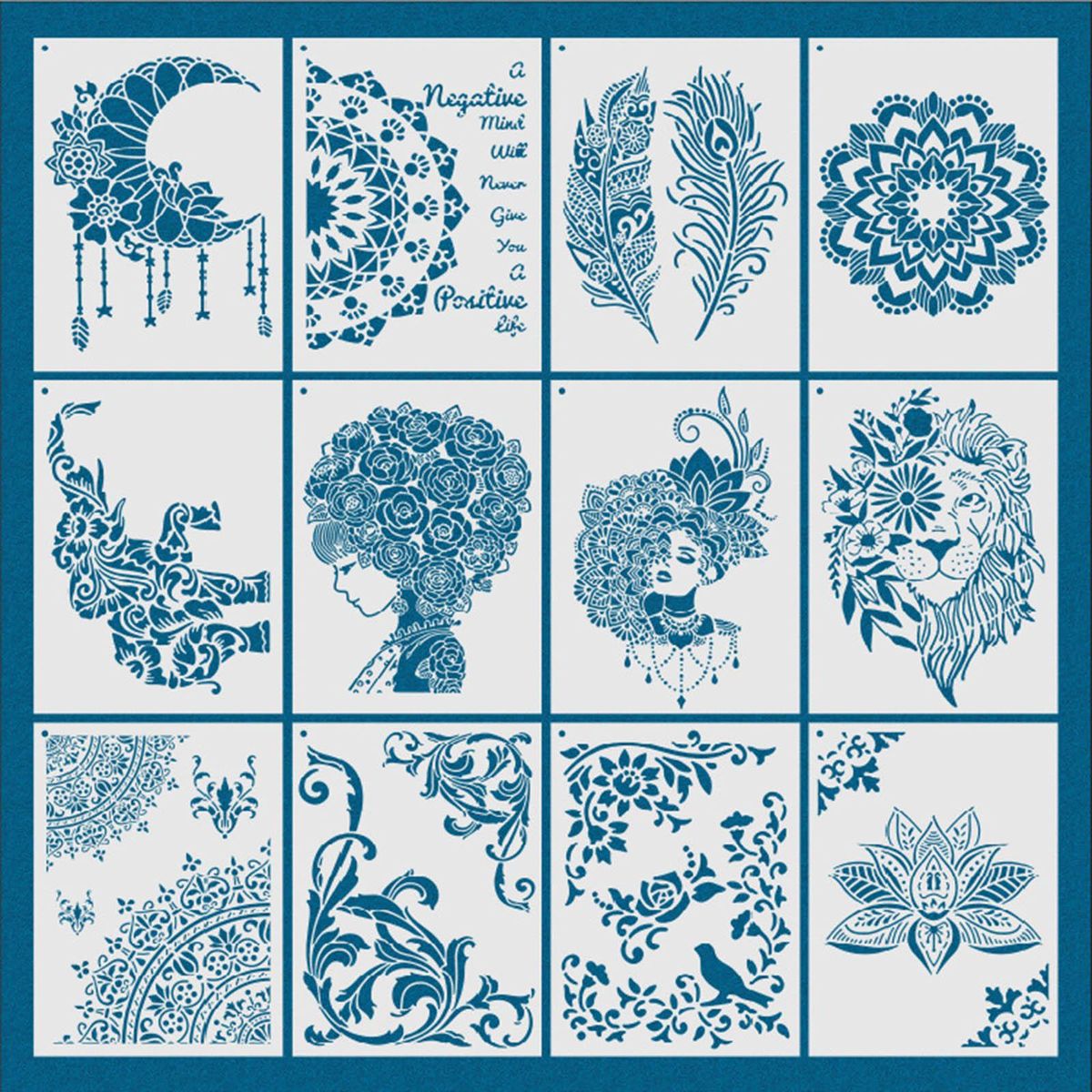 PACKAGE INCLUDES : 12Pieces different styles mandala stencils template. Quantity and size are enough for your daily DIY use. Great large stencil template set for crafts and diy projects supplies!MATERIAL : This mandala Stencils are made of reusable PET with good flexibility and durability, Don't worry about them getting dirty, they are washable.STENCIL SIZE : Each mandala stencil is A4 size 8.27 x 11.69inches, Color:White. Flexible and not sharp, cannot cut the skin. EASY TO USE : This mandala stencil template can help you save a lot and trouble when creating mandala dot painting or other crafts.WIDE APPICATION : These mandala stencils can be applied to most flat surfaces including furniture, stones ,wood,fabrics, metal,canvas, rocks,tiles, floors, cabinet, wedding crafts, furniture, tray tables , etc.