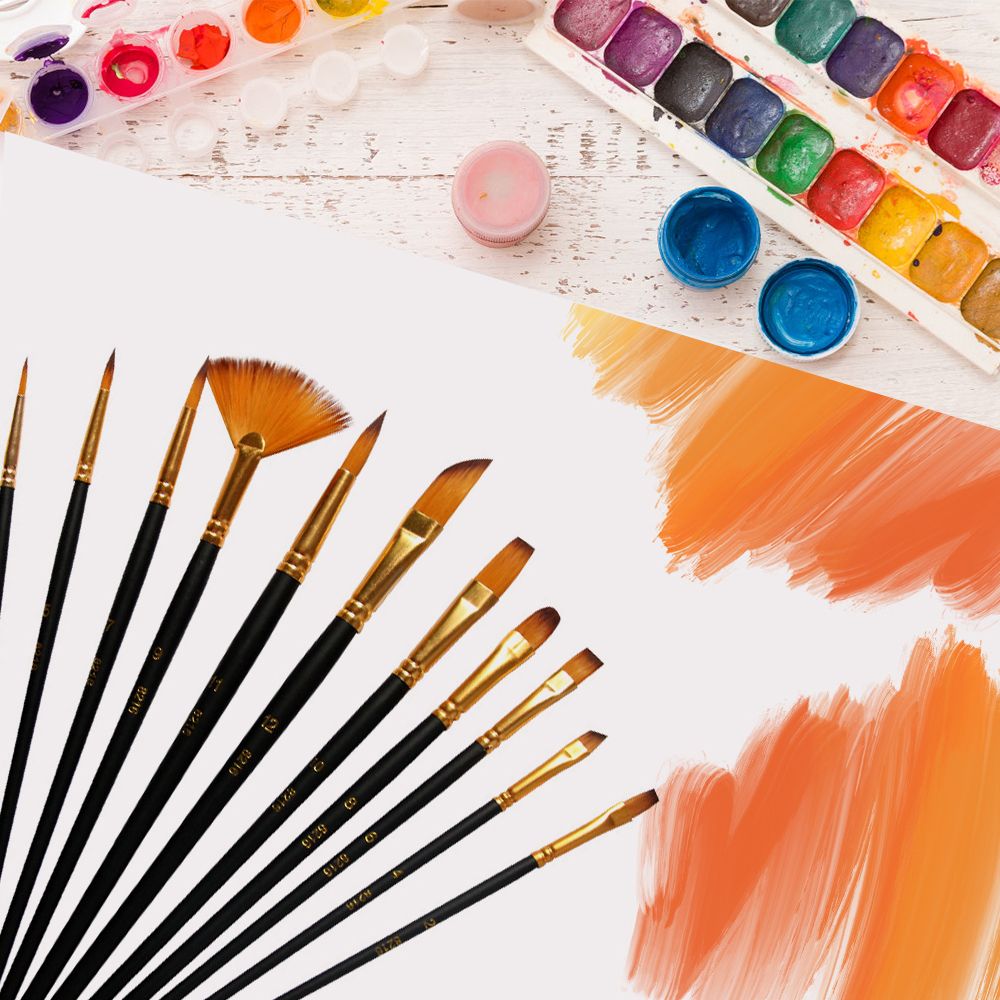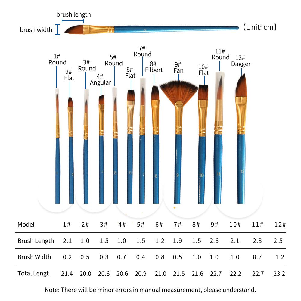 Brush Types: flat tips(#2, #4, #6, #8, #9, #10, #12); round tips(#1, #3, #5, #7, #11 )