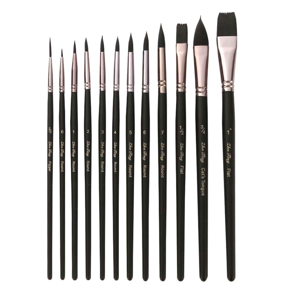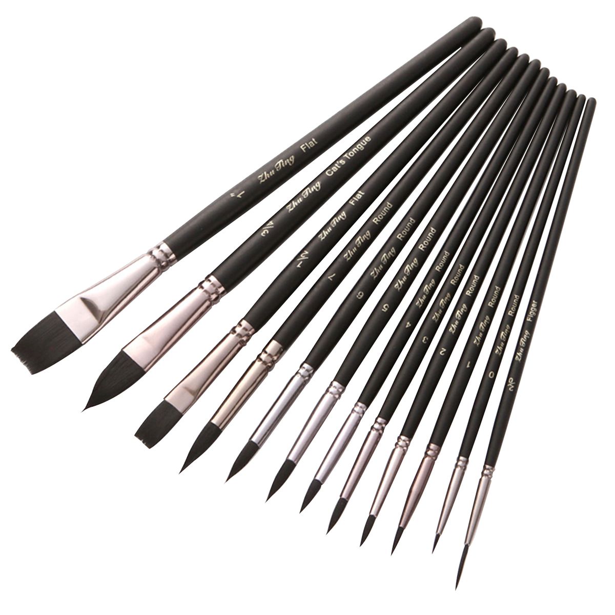 Features:12pcs paint brushes in different shape & size, which can meet different painting needs, including Round Tips(0#,1#,2#,3#,4#,5#,6#,7#); Flat Tips(1/2#,1"#,); Figger Tip(2/0#); Cat's Tongue Tip(3/4#).