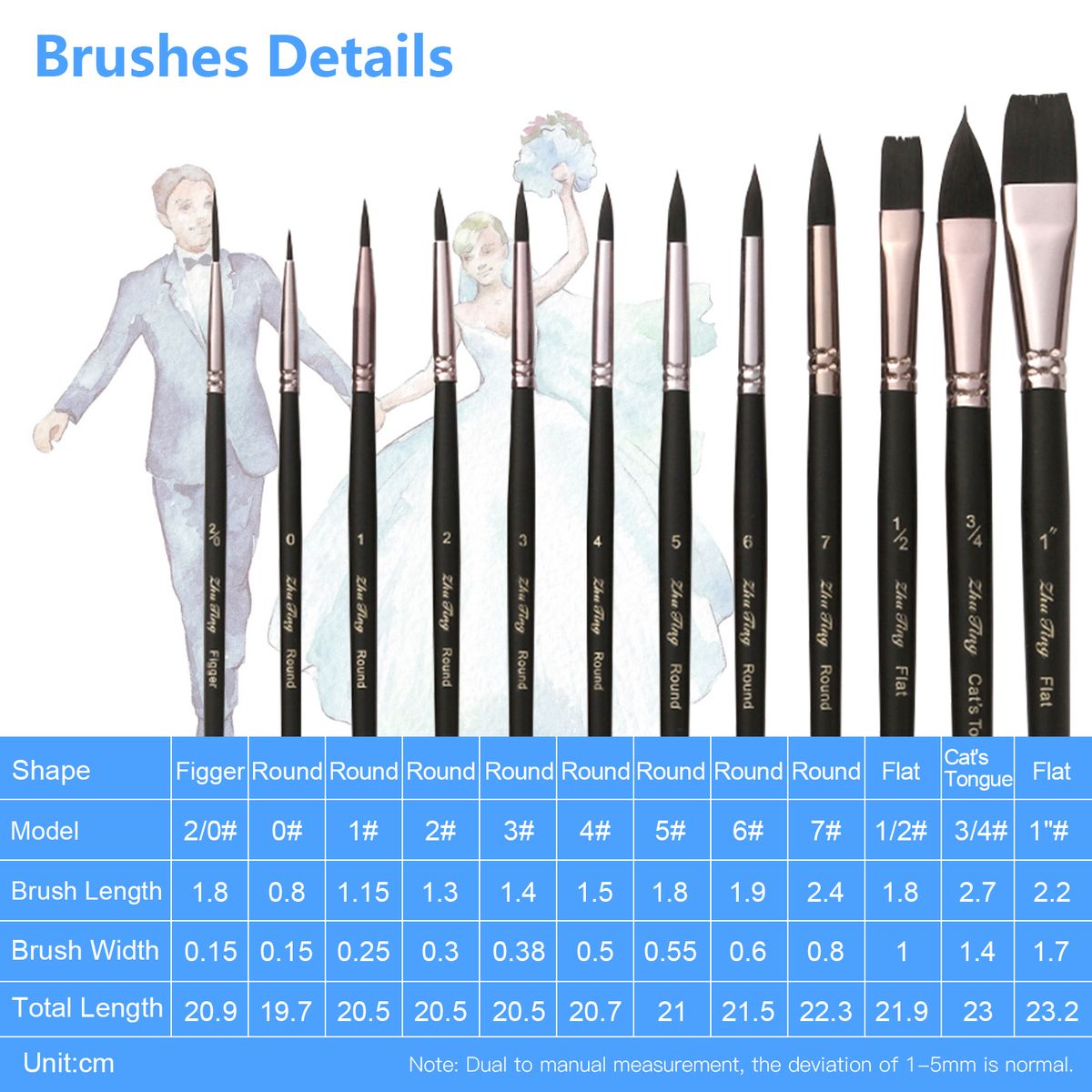 12pcs paint brushes in different shape & size, which can meet different painting needs, including Round Tips(0#,1#,2#,3#,4#,5#,6#,7#); Flat Tips(1/2#,1"#,); Figger Tip(2/0#); Cat's Tongue Tip(3/4#).