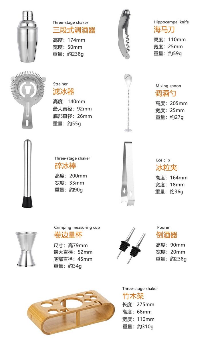 The kit includes tools such as measuring cup, hippocampus, cocktail shaker, crushed popsicle, ice filter, straw spoon, bamboo base, ice clip