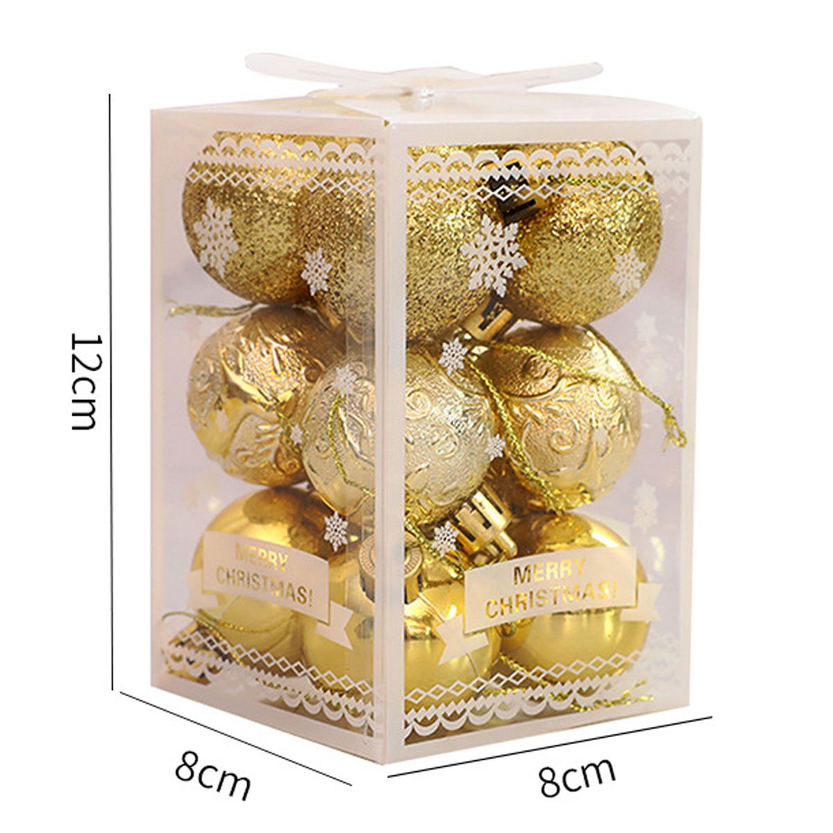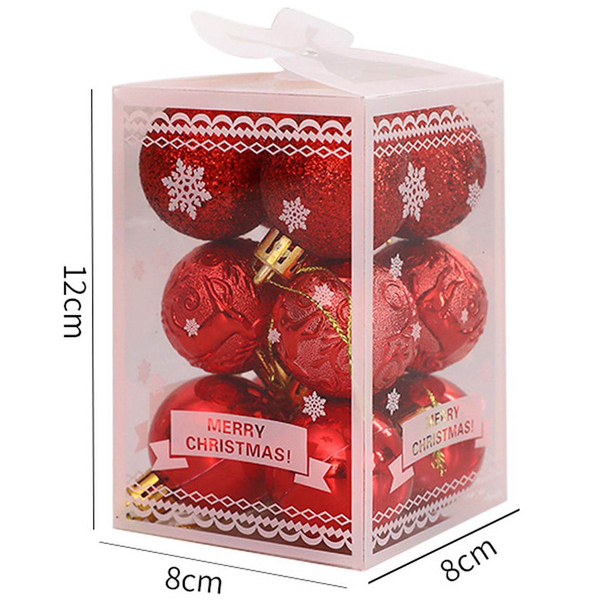 The diameter of the Xmas ball is 4cm. The length of the box is 12cm, the width is 8cm, and the thickness is 8cm.