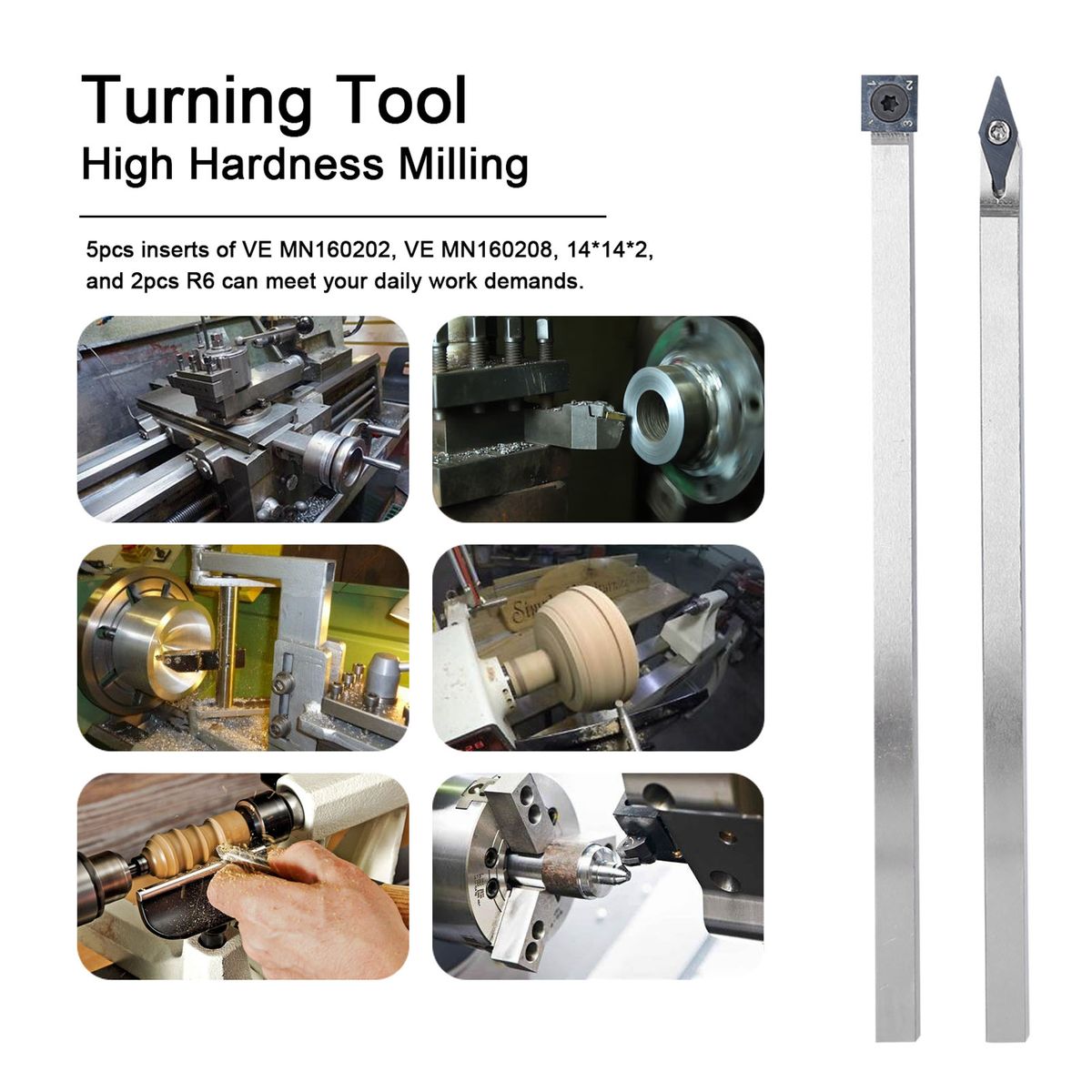 This is a set of fine quality turning tool and aluminum aluminum handle set, perfect for semi-finishing and finish operations. Fine toughness and hardness, with long service lifespan. 5pcs inserts of VE MN160202, VE MN160208, 14*14*2, and 2pcs R6 can meet your daily work demands. Square steel arbor design, making it stiffer and less likely to roll than round shaft tools. Quality aluminum alloy handle, adopts quick and easy clamping and replacement system, only need one wrench and one screwdriver to complete the replacement toolblade and shim.